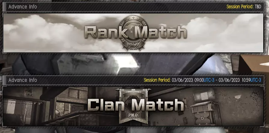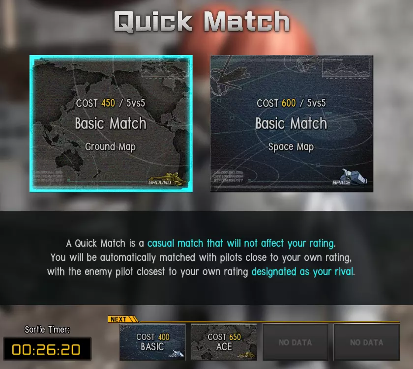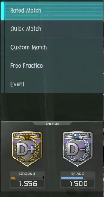 比赛分为4类:排位赛、快速赛、自定义赛和活动赛。 排位赛:常规竞技比赛,通过战斗提升等级以面对越来越强的对手。它分为不同的评级联赛:D- / D / D+、C- / C / C+、B- / B / B+、A- / A / A+、S-(最高)。某些等级是提升角色更高军衔(玩家等级)的必要条件。 快速赛:休闲模式,大多数玩家的选择,不影响你的排名,因此你可以测试新的MS并享受乐趣。 自定义赛:你可以创建自定义房间与朋友一起玩,为 clan 比赛进行训练,或加入A/B房间以更快完成每日任务。 活动赛:这里是排位赛和 clan 比赛的举办地。