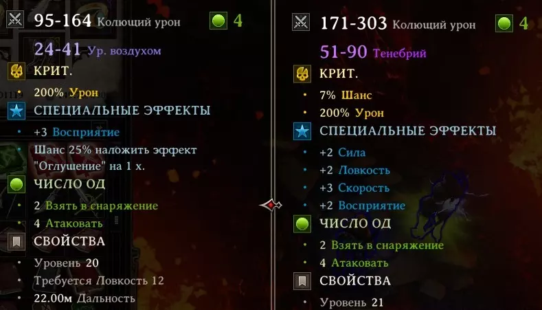 Слева мы видим среднестатистический лук, который попадается, а справа скрафченный. И так всю игру. Разница прилична. (Я про урон, статы можно навесить и на некрафченный лук). При крафте есть шанс, что лук выйдет без стат, с ловкостью или скоростью. Нам нужна скорость. Также крафтом делаем себе пояс и амулет на ловкость, инициативу и здоровье. Под конец игры амулет еще можно достать хороший, но вот найти на нас пояс очень трудно. Сущности стихий и рубины продавать не стоит. Используйте почаще сущности для апгрейда оружия и брони. Не жалейте, это может спасти вам жизнь. А вот рубины стоит поберечь. Они дают +25% резиста ко всем стихиям (кроме яда и тенебрия) и лучше всего будет использовать их перед финальными битвами, когда на вы уже точно не будете менять вещи. Расходные материалы Зелья 1. Зелья лечения (существуют от 20% до 75% восстановления здоровья). Так как у нас нет в партии хилеров, то банки становятся просто необходимы. Уже с рукоделия-5 мы научимся создавать зелья на 50% хила, что спасет нашу задницу в критический момент. Стоит всего 2 ОД. 2. Зелья сопротивления магии (существуют от 15% до 90%). Использовать мы будем их редко, обычно перед боссами. 3. Бомбы. Новинка расширенного издания. Не сказал бы что они очень полезны для нас. Без перка на точность броска бомб ими часто промахиваешься. Стоят они 3 ОД, что ниже чем у наших особых стрел и иногда все же можно тактически использовать бомбу. Особые стрелы 1. Чарующая - моя любимая стрела. Стреляете ею в самого сильного моба и наслаждаетесь тем как он пинает своих же. 2. Проклинающая - снижает все характеристики цели на 2. За игру у меня их было мало, так как крафтить их напряжно, но и тратить ее на каждого встречного моба не нужно. Использовать на вредных боссов. 3. Разрывная и огненная - наиболее часто используемые. Особенно, если видим, что у противника нет или слабый резист к огню, а также если рядом есть яд, масло. Ну и различные тактические тонкости, типа растопить лед под ногами союзника. 4. Замораживающая - я ей редко пользовался. Есть более верные стрелы для контроля. Только если моб не имеет слабый резист к воде. 5. Сбивающая - отправляет врагов в нокдаун. Полезно, когда нужен контроль. 6. Газовая и отравляющая - создает облако пара/отравляет цель. Можно использовать в комбинации с огненной, но я так редко делал. Слишком много ОД потратим, а результат не выдающийся. 7. Серебряная - видим, что у моба много брони - кидаем стрелу. 8. Замедляющая - снижает ОД у противников. В общем-то, хорошая стрела, особенно в купе с замедлением. 9. Дымовая - создает дым. Не нужна. 10. Статическая - отличная вещь. Почти гарантированный аое стан. Чаще всего я его использовал на кучки мобов или наперед движения противников на различные узкие проходы. 11. Паровая - облако пара может ослепить цель. Не нужна. 12. Водяная - помогает, если нужно загасить огонь, а умение Дождь в откате или против мобов со слабым резистом к воде. Тактика боя 1 - 5 уровни Мы еще очень слабы, у нас нет ни мощных аое, ни хорошей экипировки, ни чарующих стрел. Так что тут каждый бой начинаем с призыва пауков. Ставим их как можно ближе к мобам, чтобы те сразу начали их атаковать. В первую очередь берите в цель и контроль лучников, потом магов. Всех кто приближается к вам - Спотыкание. Особые стрелы не экономьте, они все равно стоят не дорого и легко крафтяться. 6-7 уровни Обычно уже на эти