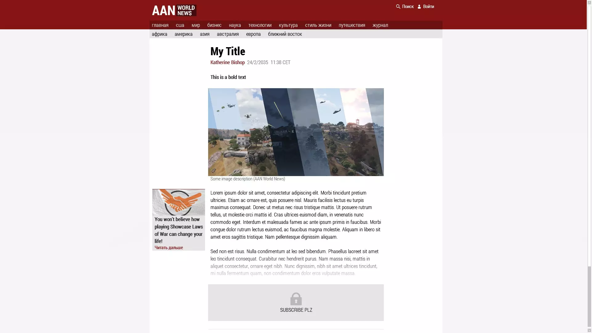 示例 哦 发生了一些 噗通声 然后 所有人都死了 颜色和大小可以根据个人喜好进行调整。 AAN文章(新闻)可以嵌入到sqf或触发器中,哪种方式方便就用哪种。 [ [ ["标题","我的标题"], ["元数据",["凯瑟琳·毕肖普",[2035,2,24,11,38],"中欧时间"]], ["粗体文本","这是粗体文本"], ["图片",["a3 Missions_F_Orange Data Img orange_overview_ca.paa","一些图片描述"]], ["方框",["a3 Missions_F_Orange Data Img Faction_IDAP_overview_CA.paa","你不会相信玩《武装突袭3》战争法则展示任务能如何改变你的生活!"]无法识别或无法翻译,已删除。肌肉质量差,在某些结缔组织中存在垫子,装饰有 nibh。Nunc 尊严,nibh 位于 ultrices tincidunt 之上,我没有发酵 quam,非调味品 dolor eros vulputate 质量。凯瑟琳·毕肖普是一名记者