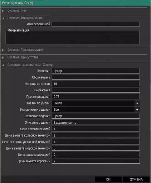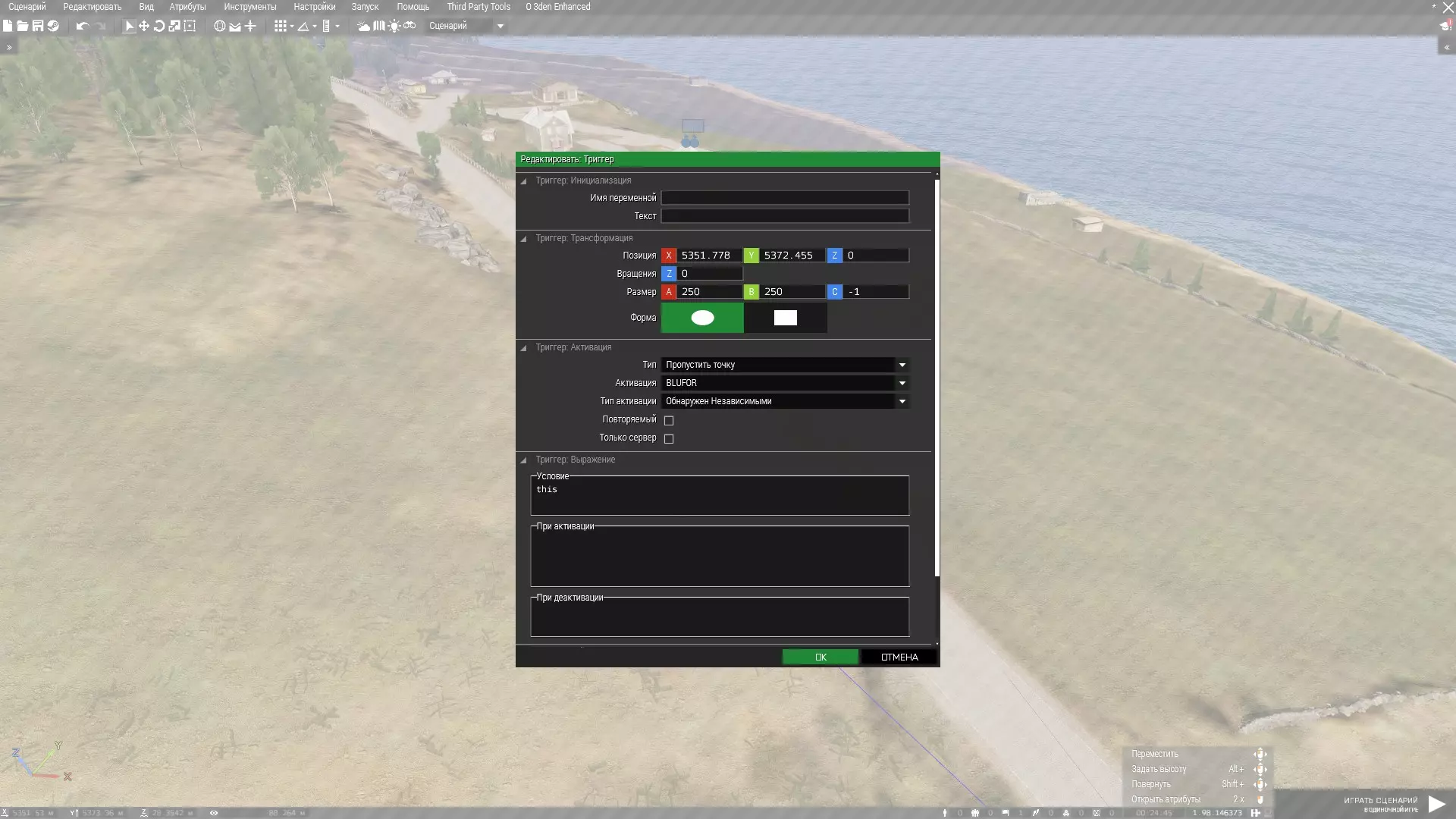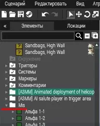 "colorCorrections" ppEffectEnable true; "colorCorrections" ppEffectAdjust [1.01, 1.18, -0.04, [1.0, 1.4, 0.8, -0.04], [0.55, 0.55, 0.72, 1.35], [0.699, 1.787, 0.314, 20.03]]; "colorCorrections" ppEffectCommit 0; Вызов поддержки Артобстрелот Dominion1859 Триггер Artobstrel.sqf Пример в триггере [[1497.998, 6609.139, 150], 15, 50, 15, "BO_GBU12_LGB", [1,2]] execVM "Artobstrel.sqf"; Объяснение [[X, Y, Z], радиус, высота, количество, "BO_GBU12_LGB", [1,5]] execVM "Artobstrel.sqf"; [X, Y, Z] - координаты цели радиус - разброс спавна, по-умолчанию 100 метров высота - высота спавна снарядов, по-умолчанию 200 метров количество - количество выпускаемых снарядов (по-умолчанию 5) BO_GBU12_LGB - класс снаряда (технически можно использовать любой объект), по-умолчанию "стреляем" авиабомбой; 1,5 - минимальная и максимальная задержка в спавне снарядов, по-умолчанию задержка от 1 до 5 секунд; Artobstrel.sqfparams ["_target",["_rad", 100], ["_alt", 200], ["_colvo", 5], ["_snar", "BO_GBU12_LGB"], ["_time", [1,5]]]; _i = 1; for "_i" from 1 to _colvo do { _result = _target vectorAdd [random _rad, random _rad, _alt]; _result2 = _result vectorDiff [random _rad, random _rad]; // Метод задания точки падения ублюдский, зато прост как пробка _timeMin = _time select 0; _timeMax = _time select 1; _timeRes = _timeMax - _timeMin; sleep (_timeMin + random _timeRes); _bomb = _snar createVehicle _result2; _bomb setVectorDirAndUp [[0, 0, -1], [0, 1, 0]]; // Спавн снаряда "головой" вниз _bomb setVelocity [0, 0, -200]; // Даем саряду пинка. При желании таким образом можно сделать снос в сторону } Пуск крылатой ракетыот Dominion1859 Триггер CruiseMissileLaunch.sqf Пример в триггере [Tonk, VLS, 3, 300, false, false, 35] execVM "CruiseMissileLaunch.sqf" Объяснение Tonk - название цели, в которую будет запущена ракета VLS - название конкретной установки VLS "3" - количество выстрелов, которое сделает VLS. По-умолчанию 1. Максимальный боезапас установки VLS - 36 ракет. 18 обычных и 18 кассетных. "300" - время, которое ракета будет знать, где находится цель. Если время выйдет до того, как ракета поразит цель - она укнется в землю. По-умолчанию 1000 секунд. "false" - true или false. Если true, то следующая ракета будет запущена только после попадания предыдущей По-умолчанию true. "false" - true или false. Если true, то боезапас установки VLS не закончится (логично). "35" - задержка между запусками. Не может быть меньше 20 секунд (время перезарядки). CruiseMissileLaunch.sqfparams ["_target", "_ust", ["_salvo", 1], ["_time", 1000], ["_wait", true], ["_infinite", true], ["_delay", 30]]; _i = 1; for "_i" from 1 to _salvo do { west reportRemoteTarget [_target, _time]; // ВСЯ сторона BLUFOR видит цель на радаре _target confirmSensorTarget [west, true]; // ВСЯ сторона BLUFOR узнает о новообноруженном объекте, как о цели _ust fireAtTarget [_target, "weapon_vls_01"]; if (_wait == true) then // Если выставлено условие ожидания, то следующий запуск ракеты произойдет только после погибели предыдущей { _rocket = nearestObject [_ust, "ammo_Missile_Cruise_01_Cluster"]; waitUntil {not alive _rocket}; } else { sleep _delay; // Эта часть срабатывает, если не выставлено условие ожидания }; if (not alive _target) exitWith {hint "Target destroyed"}; // Если цель уничтожена, VLS прекратит стрельбу. Добавлял hint для отладки. Можно ее обыграть повесив на ее место реплику, или вообще удалить if (_infinite == true) then {_ust setVehicleAmmo 1;} else {}; // Восстанавливает боекомплект ракетной установки }; Пуск крылатой ракеты v.2от Dominion1859 Триггер CruiseMissileLaunch.sqf Пример в триггере [Tonk, VLS, 3, 300, false, 35, 1] execVM "CruiseMissileLaunch.sqf" CruiseMissileLaunch.sqfparams ["_target", "_ust", ["_salvo", 1], ["_time", 1000], ["_infinite", true], ["_delay", 16], ["_wait", 0]]; // _target - название цели, или координаты // _ust - название установки VLS // _salvo - количество выстрелов, которое сделает VLS. По-умолчанию 1. Максимальный боезапас установки VLS - 36 ракет. 18 обычных и 18 кассетных. // _time - время, которое ракета будет знать, где находится цель. Если время выйдет до того, как ракета поразит цель - она укнется в землю. По-умолчанию 1000 секунд. // _infinite - true или false. Если true, то боезапас установки VLS не закончится (лог