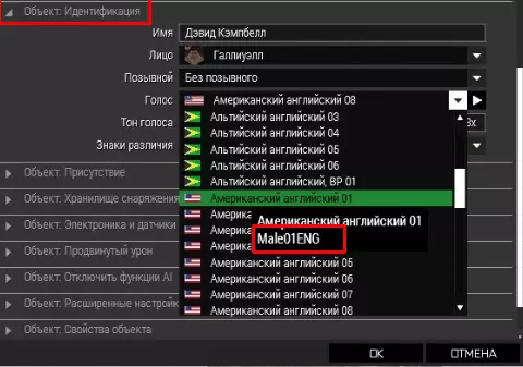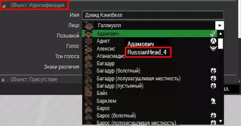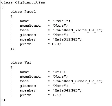 角色个性化 上述为其中一种方案,但此处将介绍一种在多人游戏中始终有效的具体情况。 角色的面部、声音、团队呼号、语音语调、面部面具(即玩家角色脸上的装饰)设置如下: description.extclass CfgIdentities { class Pawel { name= "Pawel"; nameSound= "None"; face= "CamoHead_White_09_F"; glasses= "None"; speaker= "Male01ENGB"; pitch= 0.9; }; class Wel { name= "Wel"; nameSound= "None"; face= "CamoHead_Greek_07_F"; glasses= "None"; speaker= "Male04ENGB"; pitch= 1.标注为“None”的地方并不意味着它不存在,而只是表示它未被使用。