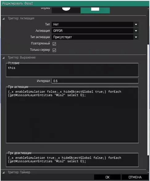 激活时 {_x enableSimulation false;_x hideObjectGlobal true;} forEach (getMissionLayerEntities "Mis" select 0); 停用 {_x enableSimulation true;_x hideObjectGlobal false;} forEach (getMissionLayerEntities "Mis" select 0); 可重复。服务器端。 现在生成我们的组合体。 然后只需将新放置的对象放入Mis文件夹