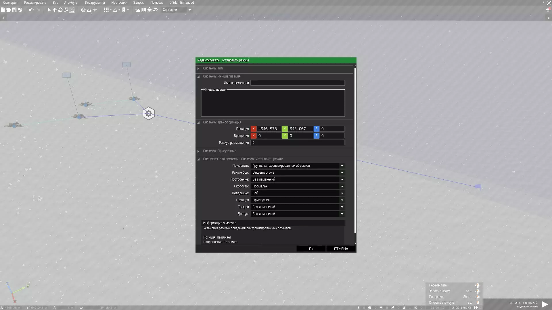 名称 数值 战斗模式 即使未受到攻击也不射击 行为 隐蔽或安全 战斗顺序 任意 速度模式 任意 单位位置 卧倒或坐姿 创建模块 - 【设置模式】并在其中执行以下操作: