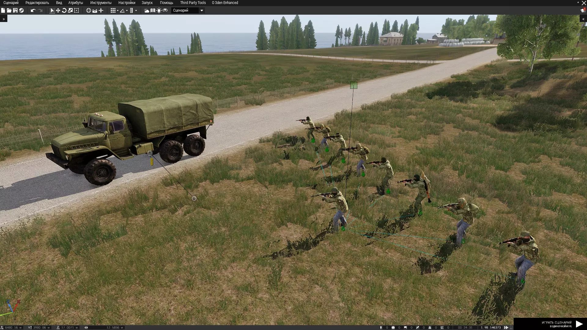 Анимация - смерть (для ботов) Убираем хп Выключаем моделирование0 = this spawn{_this switchMove "Acts_StaticDeath_04";}; Анимация - брифинг либо введение Триггер POLPOX (для удобств)Даем юнитам которые будут в анимации имя переменной (gg1 gg2 gg3 и тд) Создаем 2 триггера Пишем в первом например gg1 switchMove "Acts_C_in1_briefing"; gg2 switchMove "Acts_Executioner_StandingLoop"; gg3 switchMove "Acts_AidlPercMstpSnonWnonDnon_warmup_1_loop"; Во втором пишем (выход из анимации, не забываем про время после которого он активируется) gg1 call BIS_fnc_ambientAnim__terminate; gg1 switchMove ""; gg2 call BIS_fnc_ambientAnim__terminate; gg2 switchMove ""; gg3 call BIS_fnc_ambientAnim__terminate; gg3 switchMove ""; Рекомендую использовать на переходах затемнение экрана Использование POLPOX позволяет вам точно определить и затестить прямо в редакторе как будет двигаться или стоять юнит, выбор анимаций можете делать прям там, инструкция по применению есть в моде. Необязательно включать его в пресет, все работает без него после теста и без ошибок Примеры анимаций Анимация Анимация HubBriefing_loop Acts_AidlPercMstpSloWWrflDnon_warmup_8_loop Acts_AidlPercMstpSloWWrflDnon_warmup_1_loop Acts_AidlPercMstpSloWWpstDnon_warmup_2_loop Acts_passenger_flatground_leanright Acts_Briefing_SA_StartLoop Анимация - ранение (для ботов)от SHMEL При получении урона, бот падает, бросает основное оружие. Триггер bot_ranen.sqfLOP - имя бота sq - игрок Условие триггера (getDammage LOP) > 0.0000001 Активация null = [] execVM "bot_ranen.sqf" bot_ranen.sqf_weapon = currentWeapon LOP; LOP RemoveWeapon (currentWeapon LOP); sleep .1; _weaponHolder = "WeaponHolderSimulated" createVehicle [0,0,0]; _weaponHolder addWeaponCargoGlobal [_weapon,1]; _weaponHolder setPos (LOP modelToWorld [0,.2,1.2]); _weaponHolder disableCollisionWith LOP; _dir = random(360); _speed = 1.5; _weaponHolder setVelocity [_speed * sin(_dir), _speed * cos(_dir),4]; sleep .2; LOP lookAt sq; LOP switchMove "Acts_CivilInjuredLegs_1"; Беседы с ботомот Dominion1859 Бот параллельно звуковому файлу шевелит губами, имитируя речь. Триггер Duckspeak.sqfПример активации: [Vasya, "VasyaSpeech", false] execVM "Duckspeak.sqf" Примечание: Если для звука нужны субтитры, лучше их сразу прописать в description.ext Duckspeak.sqfparams ["_boy", "_sound", ["_is3D", true]]; // _boy - имя бота // _sound - класснейм звука // _is3D - true/false. Если true, то звук будет проигран в 3D. По-умолчанию true. if (_is3D) then // Код для 3D-звука { _sound = _boy say3D _sound; _boy setRandomLip true; waitUntil {isNull _sound}; _boy setRandomLip false; } else // Код для звука, не в 3D { _sound = playSound _sound; // Используется playSound, так как его состояние можно отследить (т.е у него есть return value), в отличие от say. _boy setRandomLip true; waitUntil {isNull _sound || !alive _boy}; // Из-за того, что playSound не привязан к объектам (в отличие от say), приходится добавлять условие на отслеживание состояния "говорящего" _boy setRandomLip false; if (!alive _boy) then {deleteVehicle _sound}; } Триггеры, условие, задача и Description Служит базой для: Скриптов; Воспроизведения звука, голоса, музыки, окружения, слоев интерфейса; Окончания или поражения для сценария; И прочего.. Активатором может быть как любой объект(проп) так и человек, игрок, ИИ, группа людей(задать владельца триггера) С объектами на сценарии можно взаимодействовать как на прямую через команду "this" так и через имя переменной - второй в основном используется если подключается триггер для активации. Создание задания