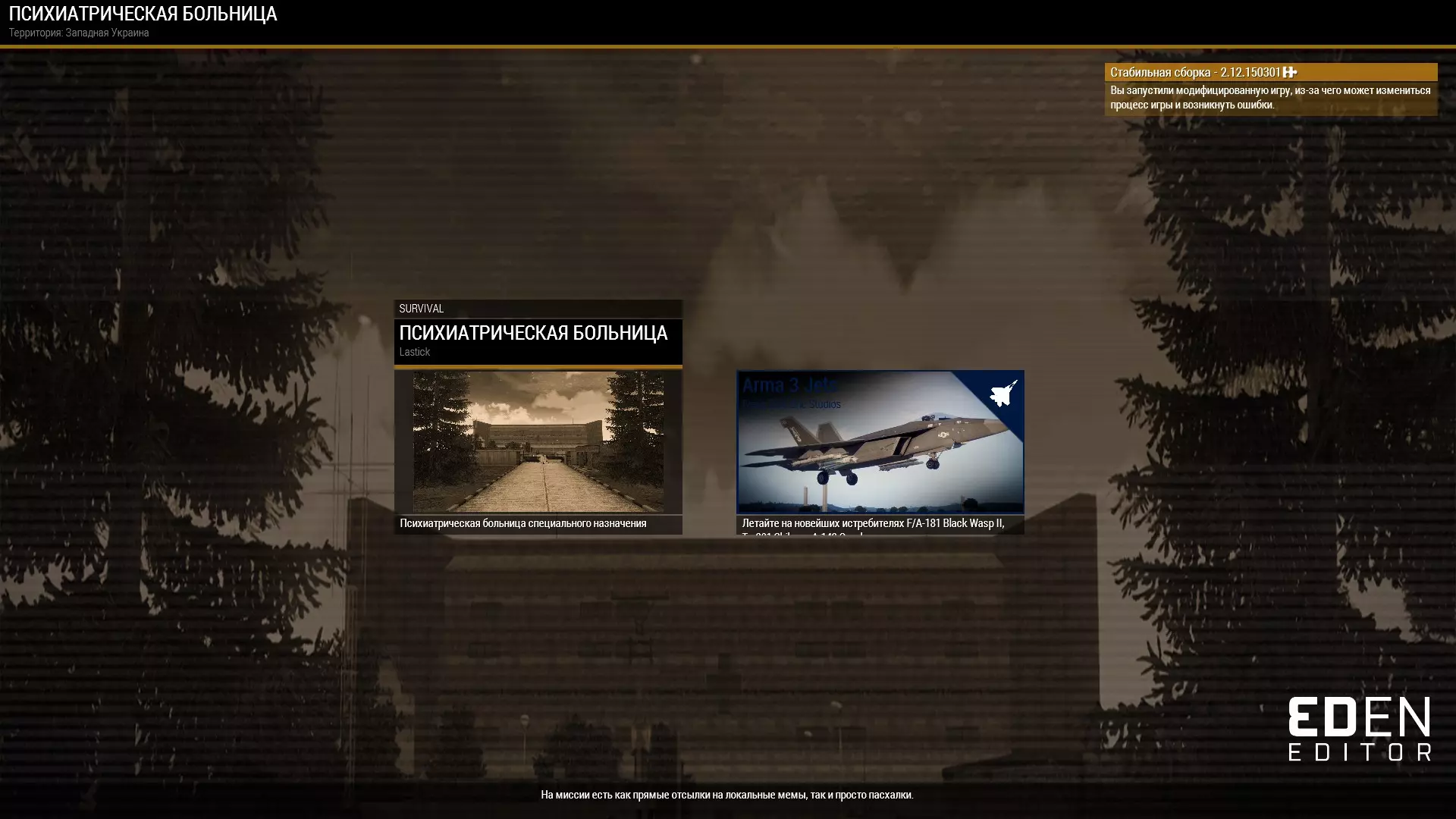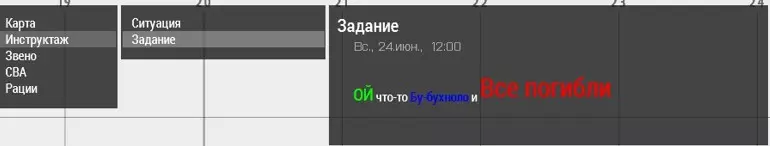 class NoEndings { endDefault = ""; }; class MissionDefault : NoEndings { lives = -1; cutscene = ""; lost = ""; end1 = ""; end2 = ""; end3 = ""; end4 = ""; end5 = ""; end6 = ""; }; class Campaign { firstBattle = "Missions"; name = "Инцидент на шахте"; briefingName = "Сценарий за спецназ."; author = "Lastick"; overviewPicture = " Coop_bm pic intro.paa"; overviewText = "Кампания из 3 миссий. Где вам предстоит поиграть в роли спецназа, которого отправили на шахту."; class MyCampaign : NoEndings { firstMission = "Paranoia_0"; name = "Военная часть 71882"; cutscene = ""; end1 = ""; class Paranoia_0 : MissionDefault { myCustomEnd = ""; endDefault = ""; end1 = ""; lost = "Paranoia_0"; template = "Paranoia_0.grassland"; }; class Paranoia_1 : MissionDefault { endDefault = ""; lost = "Paranoia_1"; template = "Paranoia_1.grassland"; }; class Paranoia_2_LLIAXTA : MissionDefault { endDefault = ""; lost = "Paranoia_2_LLIAXTA"; template = "Paranoia_2_LLIAXTA.cytech_underground_terrain"; }; }; class Missions { name = "$STR_CAMPAIGN_TITLE"; cutscene = ""; firstMission = ""; end1 = ""; end2 = ""; end3 = ""; end4 = ""; end5 = ""; end6 = ""; lost = ""; }; }; Обновления рук-ва Здесь будет информация о последнем обновлении руководства +Своя картинка на задании в миссии +Подобрать "интел" * Небольшое изменение в Важных и "средних" скриптах 03.06.21+Показать скрыть объект * Небольшое изменение в названии последнего скрипта 08.06.21+Пополнение в "Полезные ссылки" 07.07.21Скрипты низкой важности: +Выход из черного экрана +Плавное появление текста +Обратный отсчет +Эффект будто вас ранило +Еще текстуха +Статья AAN(новости) 16.07.21Файлы миссии +Своя музыка на машине радио(объекте) 20.07.21Файлы миссии +Стратегическая карта 21.08.21Полезные ссылки +Мод добавляющий скрытые предметы 31.08.21Файлы миссии +Своя картинка и текст на листе, газете и прочее 02.09.21Скрипты средней важности +Увеличить или уменьшить объект 13.10.21*Удаление неактуальной информации в важных скриптах +Альтернатива текста на экране +Телепорт на заданный маркер 23.10.21+Эффект будто резко встал с дивана +Эффект синего ПНВ 22.11.21+Маркер-указатель +Цветной текст 07.01.22+Сектор +Сейв зона 03.02.22+Текст с картинкой 19.03.22 - 22.03.22+Анимация - смерть (для ботов) +Альтернатива "радио на объекте" +Заблокировать инвентарь транспорта +Альтернатива. Бот перестает двигаться +Динамическая прорисовка объектов +Закрыть двери в здании 10.04.22+Альтернатива x2 +Плавное появление картинки на экране +Включаем фары у транспорта 16.06.22+Концовка 20.06.22+Обнаружение цели +Контроль и атака 04.08.22 - 06.08.22+2 модуля в полезные модули (время) +Управление группами +Анимация движения объекта 13.08.22+Ограничение по зоне 25.08.22+Мерцающие фонари +Нашивка +Очистить инвентарь машины 25.09.22+Рамки как в кино +Условия *Редактирование скринов(увеличение их в размере), добавление к ним таблиц где это было необходимо 23.10.22*Редактирование и перенос некоторых скриптов 17.12.22+Анимация - брифинг либо введение +Еще одна альтернатива на текстуху (Текст посреди экрана) +Виртуальный Зевс 03.01.23+Удаление 21.02.23+Главная задача 17.04.23+Загрузочный экран *Подсказка 28.08.23+Сохранение инвентаря после смерти *Условия 18.10.23*Сохранение инвентаря после смерти (добавлена альтернатива) +Радиопереговоры группы 24.10.23+Динамическая точка возрождения *Радиомолчание группы 16.11.23 - 21.11.23+Отношения сторон -Рейтинг +Задать скорость для транспорта *Сортировка скриптов влияющих на поведение ботов, см. Поведение ботов *Редактирование 27.01.24*Кардинальное изменение рук-ва 28.02.24Вызов поддержки+Артобстрел 03.03.24+Анимация - ранение (для ботов) 13.03.24+Пуск крылатой ракеты 04.05.24+Принудительная посадка вертолета 01.06.24 - 02.06.24+Пуск крылатой ракеты v.2 +Артобстрел v.2 +Стрельба по объектам (еще одна альтернатива) +Подавляющий огонь +Постобработка *Принудительная посадка вертолета (скрипт ушел в поведение бо