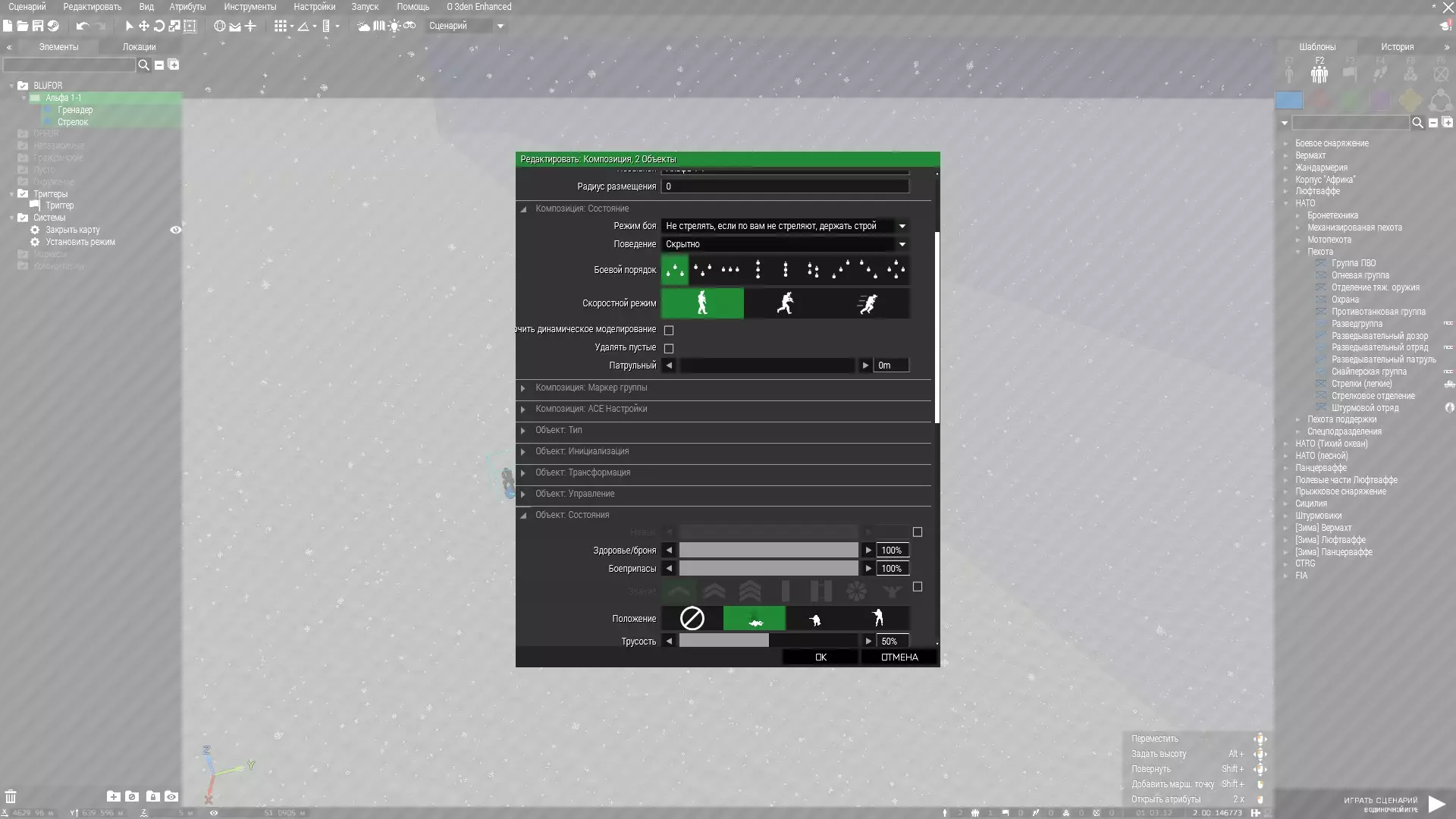 Наименование Значение Применить Группы Режим боя Открыть огонь Поведение Бой Позиция Пригнуться либо встать Создаем триггер - любой который нравится, а там указываем кто его активирует! И теперь самое простое: синхронизировать между собой это все - группы ботов с модулем "Установить режим" - а модуль с триггером. Итого что имеем - активатор делает активацию триггера, и боты выходят из пассивного режима в боевой. Контроль и атакаот Vivian Заставляет бота целиться в заданную цель unit1 doTarget unit2; Заставляет выбрать оружие unit1 fireAtTarget [unit2, "wea" ] wea это код оружия Заставляет стрелять по выбранной цели unit1 doFire unit2; Движение юнита в боюНе двигаться doStop this; - бот останется на месте Альтернатива. call{this disableAI "move";} - бот останется на месте и НЕ будет поворачиваться (только 40 градусный сектор перед ним) Альтернатива. this DisableAi "PATH" - бот останется на месте и будет поворачиваться на 360 градусов Задать скорость юниту Имя Значение бег this forcespeed 8; трусцой this forcespeed 4; ходьба this forcespeed 2; Задать скорость для транспортаjeep setCruiseControl [скорость, true/false]; jeep - имя переменной транспорта Имя Значение True транспорт сам будет поддерживать заданную скорость, если водитель не будет жать тормоз/назад (можно увеличивать газ и превысить заданный минимум). False транспорт получит максимальное значение скорости и не сможет превысит его независимо, от тормоза/газа который прожимает водитель. Задать высоту полётаMyHeli FlyInHeight 100; (MyHeli - имя переменной) (100 - высота(Пример для вертолета:Сначала идет подъем на нужную высоту, а только потом движение)) Либо задаем напрямую через this Принудительная посадка вертолетаот Dominion1859 Скрипт, который заставляет вертолет сразу садиться, а не кружить над посадочной площадкой до бесконечности Триггер Landing.sqf Landing.sqfparams ["_heli", "_helipad", ["_mode", "LAND"]]; // _heli - имя вертолета // _heipad - имя посадочной площадки (желательно невидимой) // _mode - String. Режимы посадки. Доступны "LAND", "GET IN", "GET OUT". По-умолчанию "LAND". _heli move getPosATL _helipad; sleep 3; while { alive _heli && not unitReady _heli } do{ sleep 1;}; if (alive _heli) then{ _heli land _mode;}; Активация где угодно: [_heli, helipad, "LAND"] execVM "Landing.sqf" Запрещает юниту отступатьthis allowfleeing 0; если 1 - разрешает Стрельба по объектамstrelok1 doSuppressiveFire (getposASL target1); strelok1 - стрелок target1 - имя переменной(цель) Альтернатива s doTarget t; s doSuppressiveFire t; Альтернатива от Dominion1859 Отменяет приказ на движение и заставляет юнит начать стрелять. params ["_target", "_shooter", ["_infinite", false], ["_ammomode", false]]; // _target - объект-цель. Можно сделать невидимым // _shooter - тот, кто будет стрелять. Можно указать несколько юнитов (как массив), но только если они входят в одну группу // _infinte - true или false. Если true, то стрельба будет вестись до исчерпания боезапаса. По-умолчанию false. // _ammomode - true или false. Если true, то боезапас у стрелка станет бесконечным. _i = 1; _target2 = getPosASL _target; if (_infinite) then { for "_i" from 1 to 10 do { _shooter doSuppressiveFire _target2; sleep 1; _i = 1; if (_ammomode) then {_shooter addEventHandler ["reloaded", {_shooter setVehicleAmmo 1}]}; }; } else { _shooter doSuppressiveFire _target2; if (_ammomode) then {_shooter addEventHandler ["reloaded", {_shooter setVehicleAmmo 1}]} } Поведение ботов ч2 Подавляющий огонь от Dominion1859 Боевая машина начинает стрелять по цели, пока цель либо техника(сам стрелок) не будет уничтожена. Триггер Firemis.sqfПример в триггере [BTR, Tar, currentMuzzle (gunner (BTR)), 60, true] execVM "Firemis.sqf" Firemis.sqfparams ["_shooter", "_target", "_muzzle", ["_RPM", 60], ["_infinite", false]]; // _shooter - имя техники, который будет стрелять. // _target - имя цели. Или AGL-координаты цели // _muzzle - класснейм ствола. Также можно использовать currentMuzzle (gunner (BTR)) // _RPM - число. Кол-во выстрелов в минут
