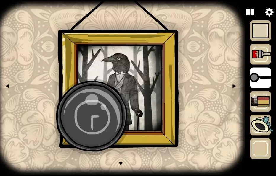 前往有窗户的房间(向右转1次),将照片板插入空相框中。 在猫头鹰衬衫上可以看到圆点,需要在位于剧院房间(向右转2次)的音乐柜里的纸片上扎出这些圆点。 然后转动箱子的把手。旋律结束后,下方会打开一个抽屉,从中取出钥匙。 前往有窗户的房间(向右转2次)。 用钥匙打开左侧床头柜上的箱子。拿起手枪。 前往法赞女士处(右转1次)并交付手枪。 前往有相机的房间(左转2次),插入玻璃并拍照。 返回法赞女士处(右转2次),点击她的身体。 获得法赞的胸针及成就。