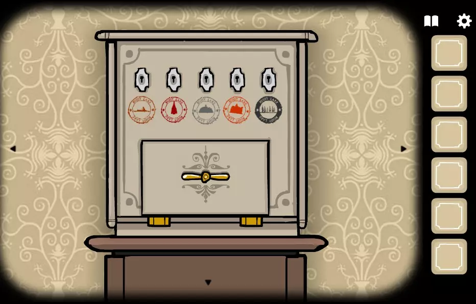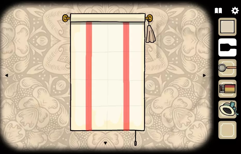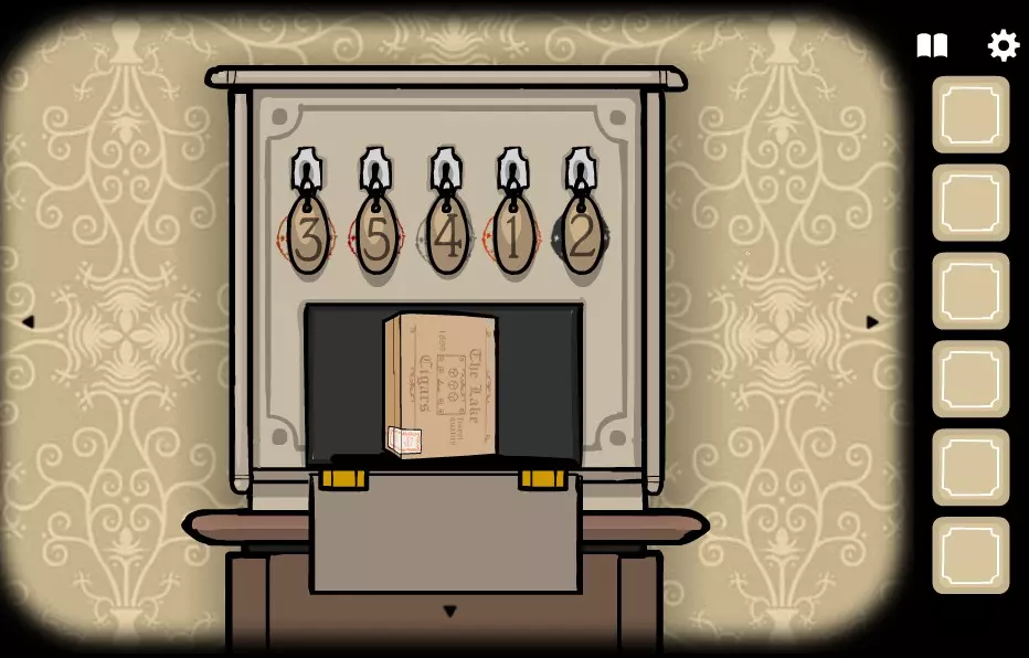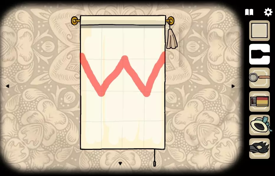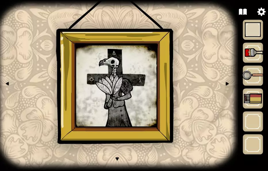 前往有窗户的房间(向右转1次)。 将照片放入空相框中。 在左侧树的树干底部,会画有一个带指针的时钟。 记住指针指向3:30的位置,并在有剧院的房间(向左转2次)里设置时钟。 获取目录。 要转动分针,需点击表盘中心;要转动时针,需点击带数字的圆圈。 点击剧院并打开幕布。将目录交给左边的女性。持续点击女性角色,直到右上角出现斧头。拿起斧头并交给右侧的男性角色。点击男性角色,直到女性角色身上露出部分脊椎。点击脊椎获得火绒盒。拿起火绒盒,交给女性角色,点燃火绒盒,点击女性角色,点击火焰中的男性角色,获得金钥匙2。选择金钥匙2并点击柜子的左侧抽屉。获取猫头鹰面具