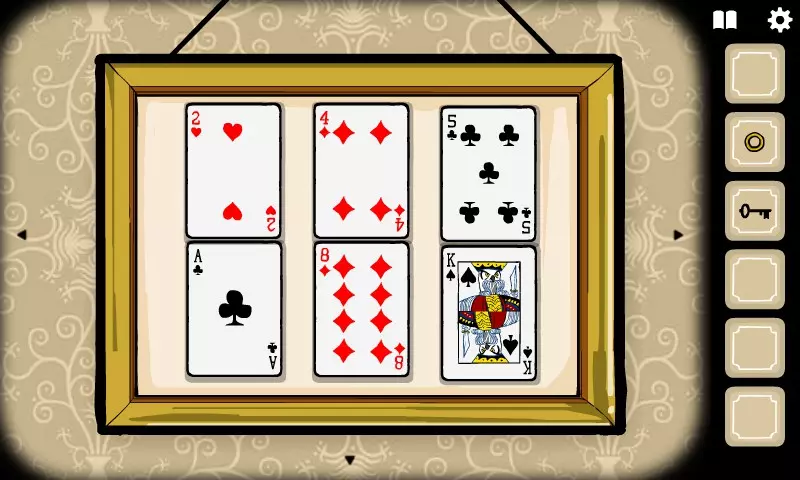 每张卡牌都有其对应的符号,除了刀具房间外,整个区域的墙上都挂着提示。 按以下顺序排列: 上排:2 - 4 - 5 下排:A - 8 - K 移开梅花5卡牌,获取钥匙2。 返回有兔子面板的房间(向左转动1次)。 点击左侧的桌子,将戒指放入桌上的盒子中,获取钥匙3。点击锁着的柜子,打开抽屉,点击柜子,将石头三角形放入小门上,点击小门两次,将兔子先生的眼睛放入头骨中,点击小门四次,拿起剑。 前往有刀的房间(向右两次)。 点击垂直箱子里的兔子先生,并按照左侧图画指示的顺序插入剑。顺序:1-4-5。点击兔子先生2次,获取兔子爪子和成就。