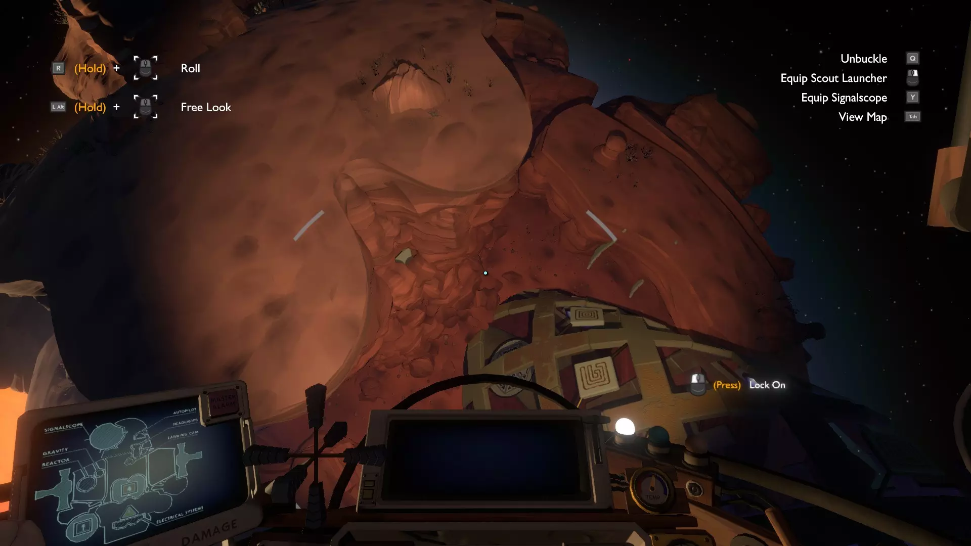 2. 前往加布博罗处获取冥想物品。你只需前往那里,与他谈论你正处于时间循环中,然后在下一个循环里,问他“面对即将到来的末日,你是如何保持如此冷静的?”。 3. 为你将要承受的绝对全面的精神冲击做好心理准备。同时,确保你有足够的耐心——有些事情你必须反复尝试多次才能完成,所以要记住完全通关《星际拓荒》后的那种满足感。 现在,言归正传: 让我们开始。 本体游戏,简单难度 本节将介绍本体游戏中(在我看来)比较容易的成就。如果你没有DLC,只需完成本体游戏的简单和困难部分。我会按星球来分类这些成就。如果涉及多个星球或可在多个星球完成,我会标注你需要前往的星球。如果仅需在太空完成,我会标注为【太空】。如果可在任意地点完成,我会标注为【任意地点】。很简单! 【任意地点】嗯,致癌物…… 烧掉10个棉花糖并吃掉它们。至少暗示加布博罗只是烧掉它们然后处理掉。你却……呃。 嘿,这个按钮是干嘛的? 当你在飞船里(希望离村庄很远),坐着时按住ALT键环顾飞船内部。飞船主控制台的右下角会有一个小按钮。掀开卡扣并按下它。你穿好宇航服了,对吧? 【成就:Cutting it Close】 耗尽所有常规燃料。你的喷气背包将切换为使用氧气罐作为推进剂。从这里开始,你必须消耗大部分氧气——直到60秒警告出现——然后迅速登上你的飞船。当然,你也可能直接窒息。现在屏住呼吸! 【It was worth a shot】和【Harmonic Convergence】 这两个成就相辅相成——不过,【It was worth a shot】需要花不少功夫。驾驶你的飞船飞离太阳(任何方向都可以),一直飞。你需要飞得足够远,这样当时间循环结束时,你才不会处于超新星内部。我个人的做法是,在循环开始时就进入飞船并立刻向后飞行。所以,把油门踩到底,你会有足够的时间。如果飞船试图带你回到星系/太阳附近,只需按X键——这会取消自动导航。在进行此操作时,只需让你的飞船保持信号镜激活状态(按Y键使用飞船信号镜),将其调谐至星际拓荒冒险队频率并对准你的星系。最终,由于你距离足够远,所有行星会排成一线,你将同时听到所有宇航员的演奏!恭喜!不过,希望你带了额外的零食,这将是一段漫长的旅程。 沙漏双星:你遭遇了不幸的命运。 好的,在我看来,这是获得该成就最简单的方法: 降落在余烬双星上,靠近重力炮。在一处岩石露头处应该有一个小洞。这是进入无光之城的便捷入口。