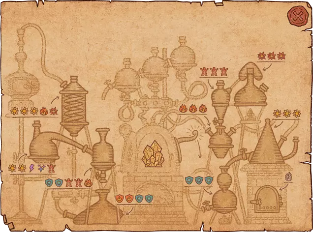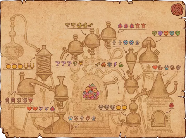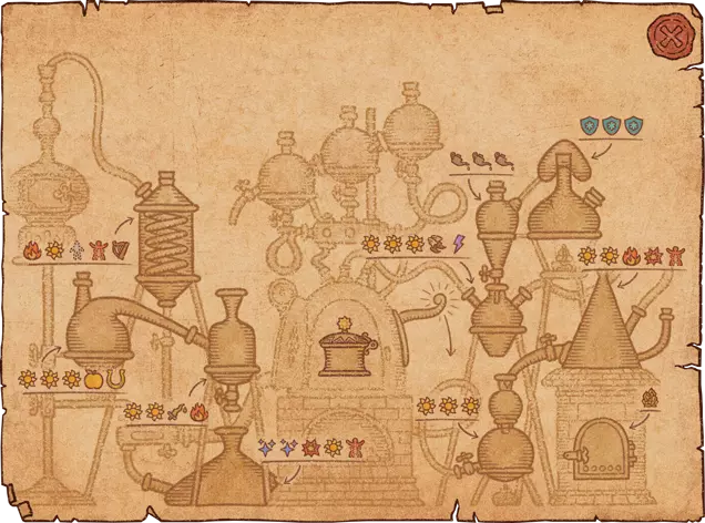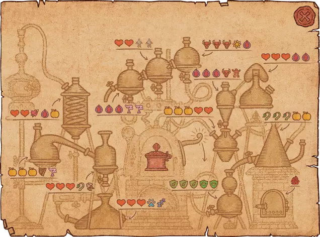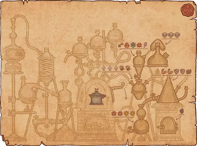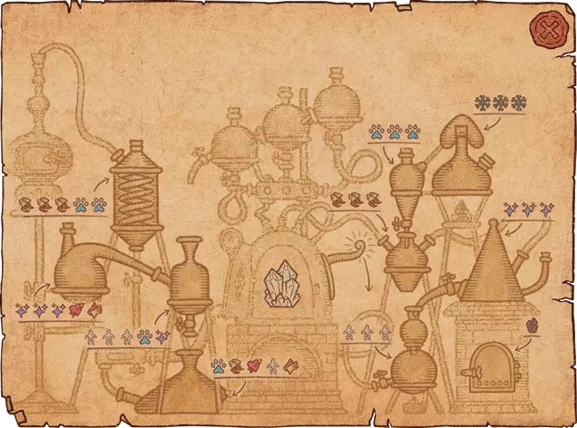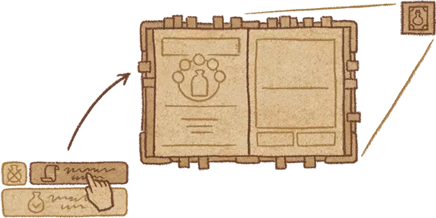 1.你需要将风箱上方的水瓢倒入大锅。水瓢位于大锅上方。 2.查看制作界面——我只需要你最强的药水! 3.你需要制作一个带有任意效果的药水。但在完成药水之前,将瓶子移动到另一个药水效果上,以将其添加到瓶子中。同一个瓶子最多只能有5级效果,若尝试添加更多则会覆盖原有效果。带有单一效果的气泡需要(字面意义上)移动到另一个效果上,在其“叠加”后完成药剂。如果效果的强度超过效果的空闲槽位数量,它将覆盖已填充的槽位。 4. 你初始拥有12张配方纸。可以通过向炼金商人或旅行商人以每张200金币的价格购买魔法纸来解锁更多配方纸。配方书中初始有12页。它们可以在炼金术士商人以及流动商人处以200金币的价格购买。