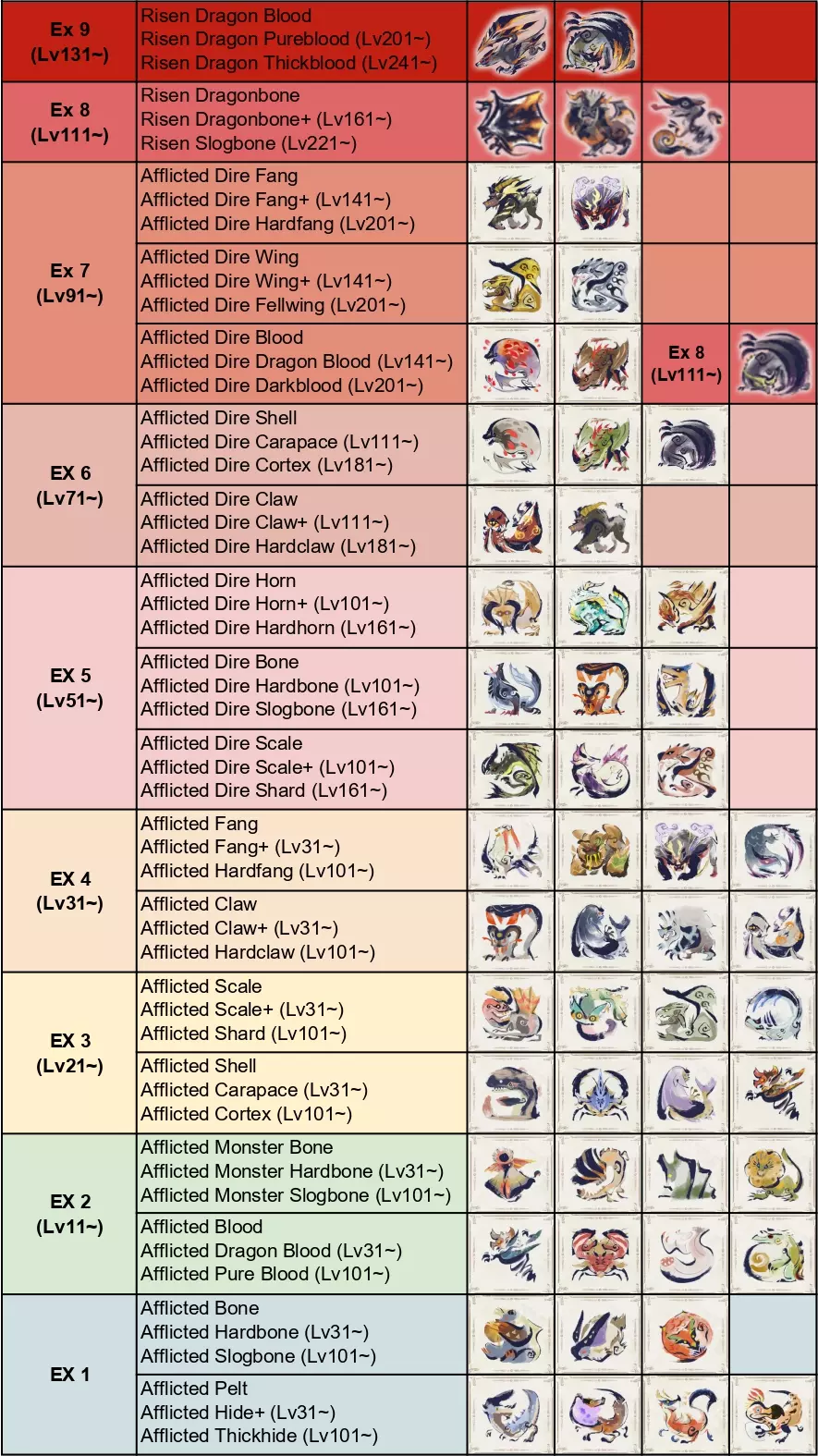 更新日志 [24-11-2022]更新表格以包含TU3内容。数据来源于数据挖掘网站,尚未与游戏内数值进行验证。 [25-11-2022]移除混沌黑蚀龙。 [28-11-2022]为所有非默认素材添加了对应的掉落等级。 [25-12-2022]添加了中文和日文版本的链接。 [08-02-2023]更新表格以包含TU3内容。添加了各层级怪物开始出现的调查等级。 [30-04-2023]更新表格以包含TU4内容。抱歉更新延迟,且对视觉效果做了轻微调整。