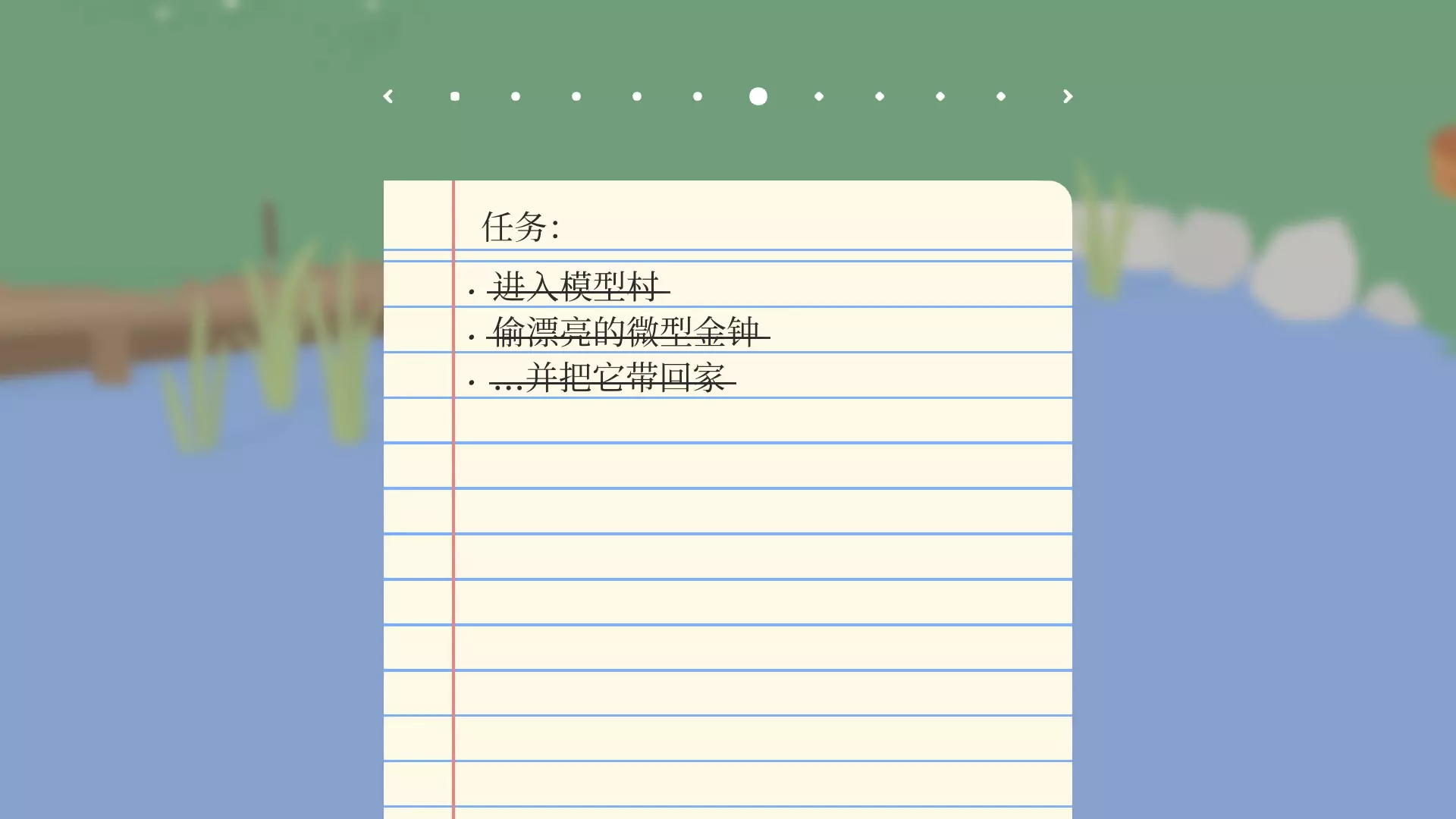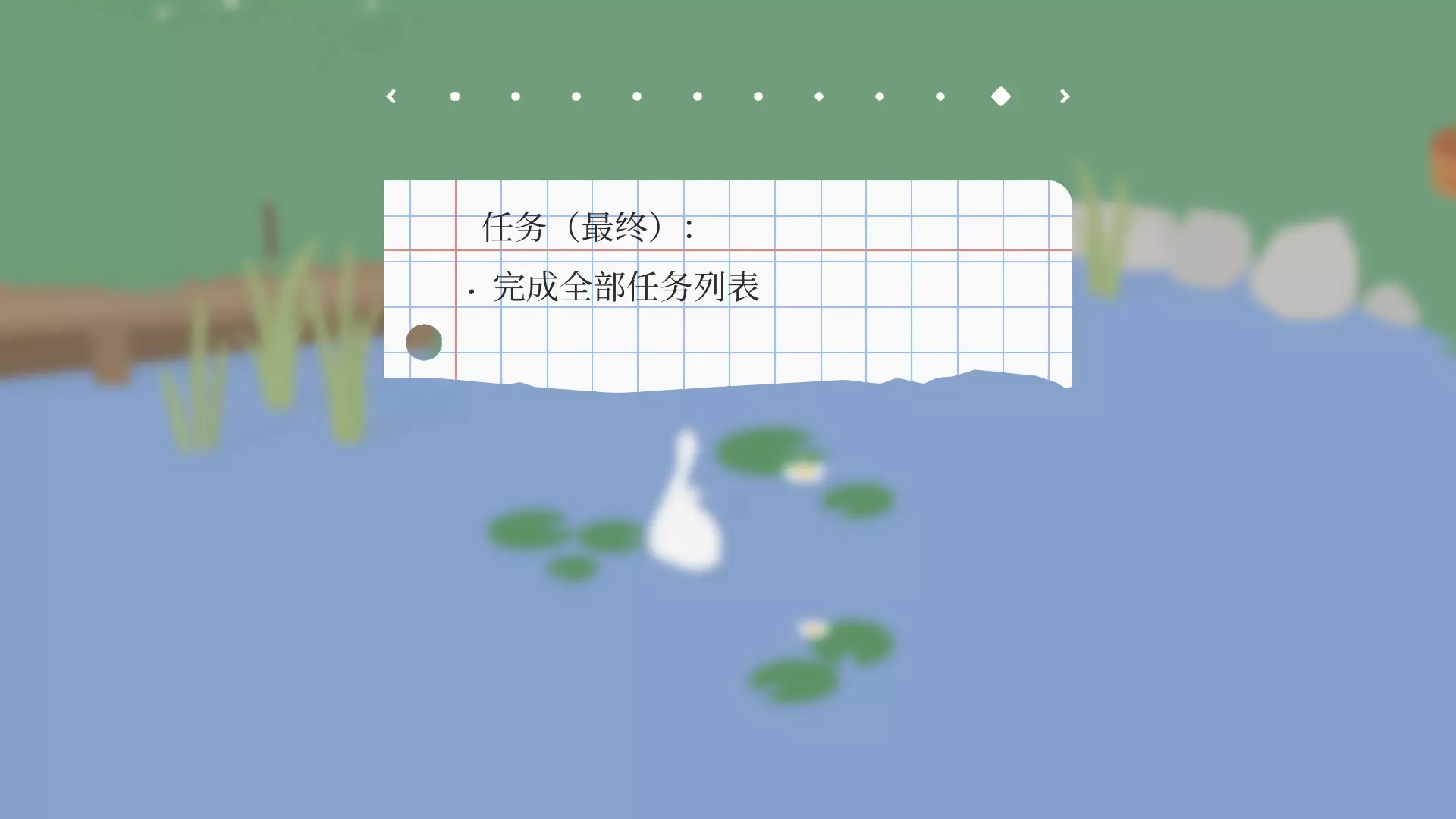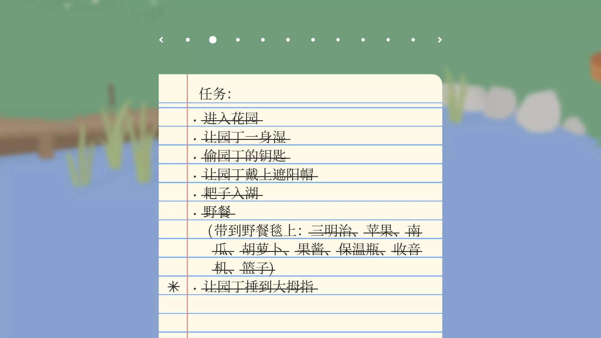 进入花园///———打开门外水阀,园丁会用钥匙把门打开,进入花园 让园丁一身湿///———拿走园丁的东西后把园丁引到湖里(嘴里叼着园丁的东西,园丁会过来追你) 偷园丁的钥匙///———钥匙在园丁腰上,靠近即可叼走 让园丁戴上遮阳帽///———叼取园丁种植的花朵,让园丁重新种植的时候把他的帽子叼走 耙子入湖///———把花园里的耙子拖到湖里(不要被园丁发现!)剧情外任务(成就) 野餐:把三明治、苹果、南瓜、胡萝卜、果酱、保温瓶、收音机、篮子放到小湖旁边的野餐毯上(都可以在地图中找到,注意不要被园丁发现,他会过来抢),野餐毯子在湖右边。 让园丁锤到大拇指:完成其他任务后,园丁会设立禁鹅指示牌,在园丁挥锤的时候叫一声,园丁会吓一跳,然后砸到自己的手指。