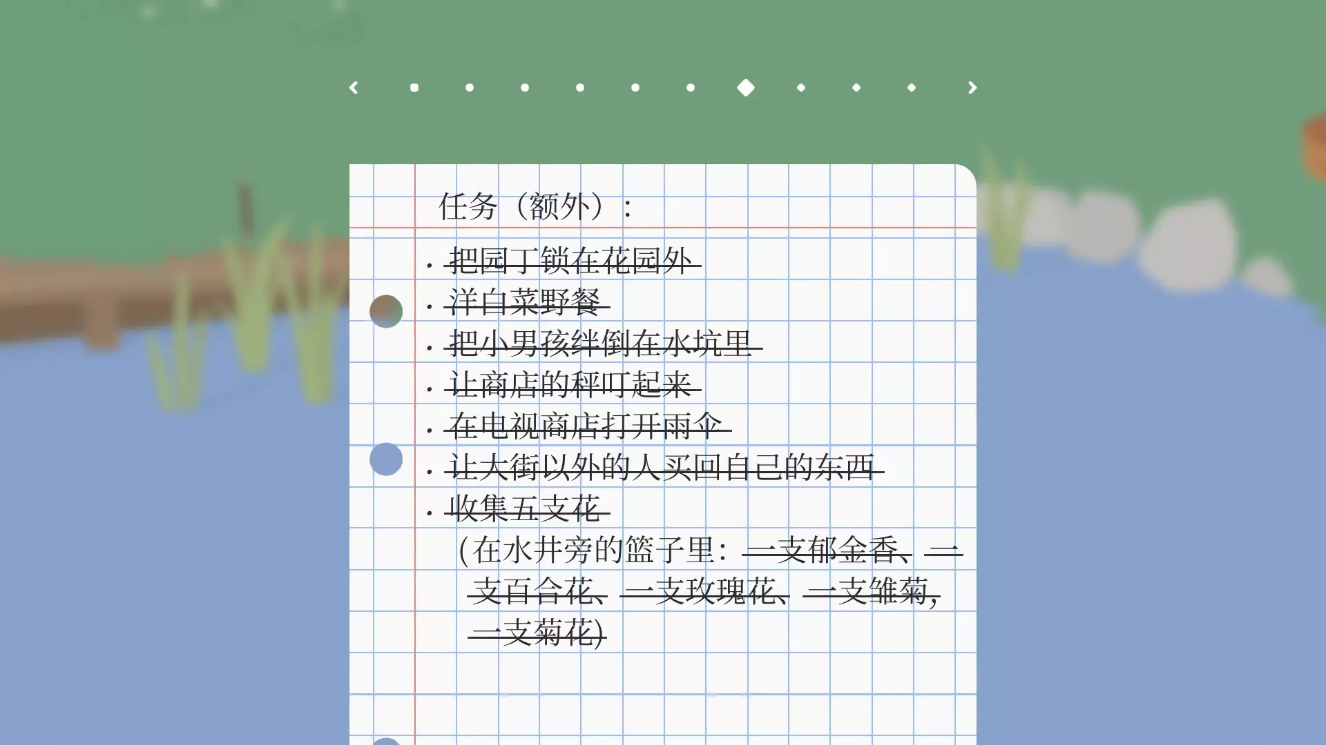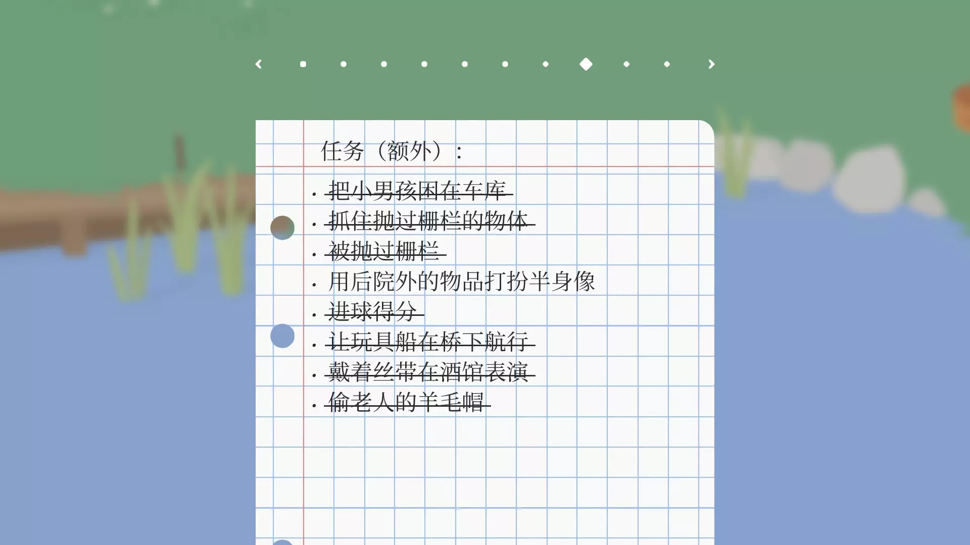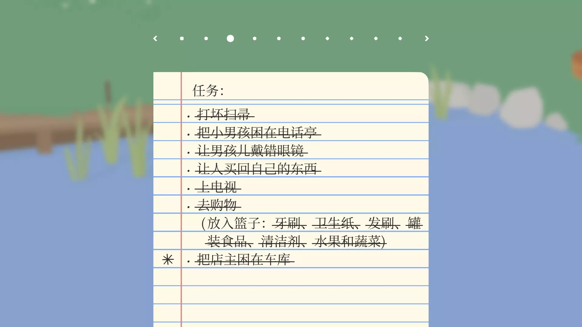 打坏扫帚///——进入大妈的商店,大妈会拿扫帚驱赶,咬住扫帚拽几下就能将其弄坏。 把小男孩困在电话亭///——小男孩害怕大鹅的叫声,用叫声可将小男孩吓到电话亭里。 让小男孩戴错眼镜///——趁小男孩摔倒时把他的眼镜拿走,再从商店拿一副眼镜放到他边上,由于小男孩看不清楚,就会捡起不是自己的眼镜戴上。 让人买回自己的东西///——把小男孩的飞机叼到商店,再把小男孩追到商店,让他买回自己的飞机。 上电视///——小男孩被困到电话亭后,电视机店老板会开门出来,进去后按门口的按钮,电视机店里所有的电视都会现场直播你的样子。 去购物///——把牙刷、卫生纸、发刷、罐装食品、清洁剂、水果和蔬菜放到篮子里(牙刷和清洁剂在商店右侧的垃圾桶里)。把店主困在车库:拿走商店的东西,把大妈引到车库里,然后迅速拉下铁环,车库的门就会关上。剧情外任务【成就】