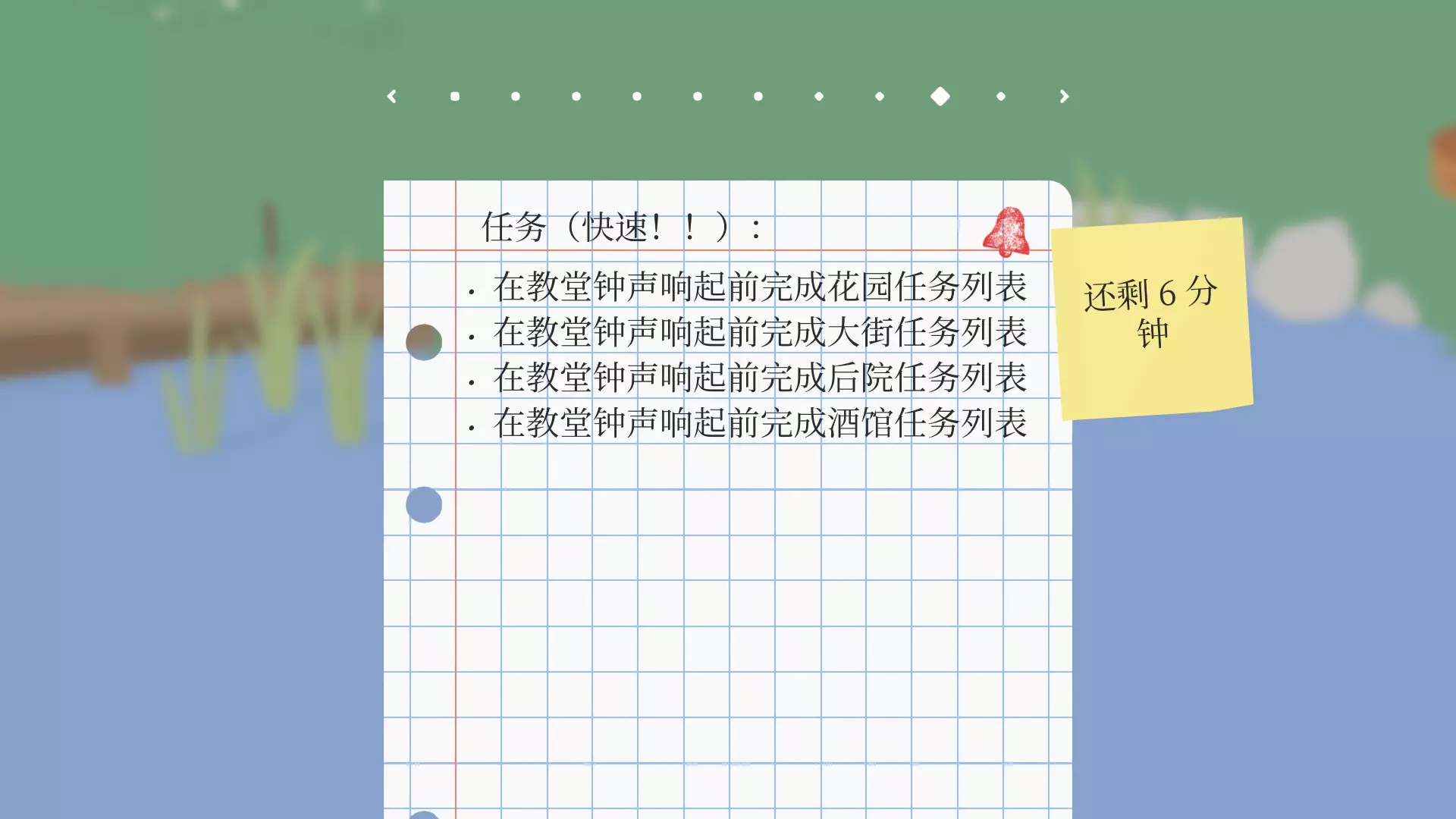 在教堂钟声响起前完成大街(老样子,最好在一周目后做) 后院 剧情任务列表