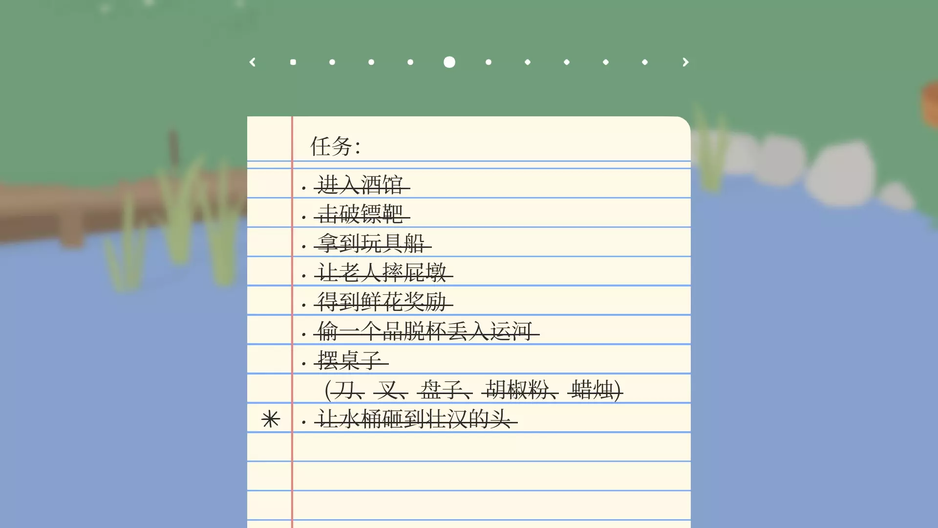 进入酒馆///———— 藏进门口的纸箱等服务员把你送进去,解掉守卫的鞋带跑进去 击破标靶/// ———— 在老人将要把飞镖扔出去的时候叫一声 拿到玩具船///———— 打开酒吧洗手池的水阀,等水池满水后拿走玩具船 让老人摔屁股墩///———— 在老人坐下之前拽走凳子 偷一个品脱杯丢入运河///———— 把酒馆里的透明杯扔进河里(杯子都摔碎了也没事,女服务员会在最上面的推车重新拿出来一个) 摆桌子///———— 摆盘(刀,叉,盘子,胡椒粉,蜡烛),“桌子”指的是后院的,上面放着桌布的卷线轴 让水桶砸到壮汉的头///————把后门的苹果都摆到地上,引守卫过来,进酒馆推下水桶。剧情外任务【成就】