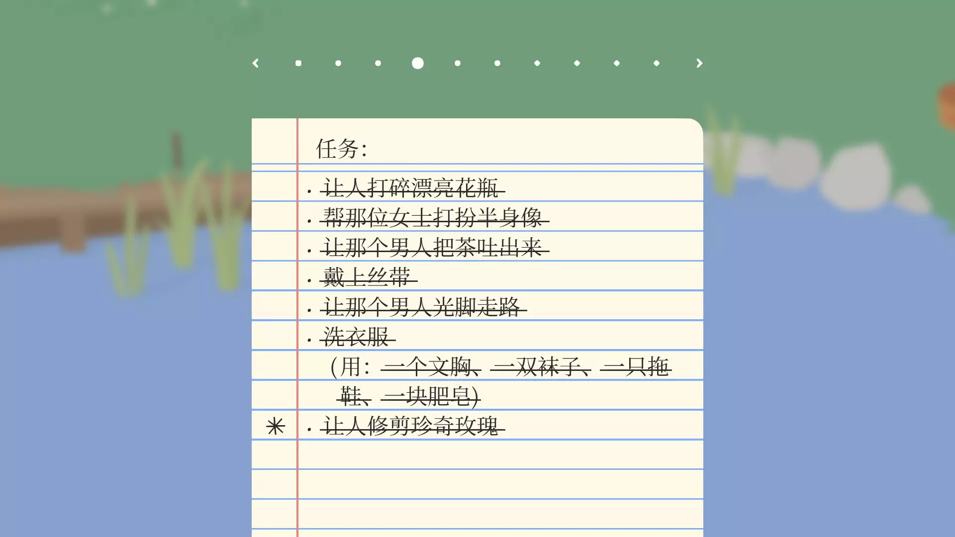让人打碎花瓶///———将女主人那里的紫色花瓶放到男主人处 帮那位女士打扮半身像///———把男主人的帽子、眼镜和烟斗放到女主人院子半身雕像下的盘子里 让那个男人把茶吐出来///———在男主人喝茶时敲钟 戴上丝带///———把女主人的鹅雕像藏起来,自己站到雕像位置等待女主人给自己戴上丝带 让那个男人光脚走路///———在男主人看报纸和喝茶时趁机叼走两只拖鞋 洗衣服///———把女主人的文胸、两只袜子、肥皂以及男主人的鞋,放到男主人区域的池塘里 让人修剪珍奇玫瑰///———拖动玫瑰花盆,到女主人区域碰几下玫瑰旁边的植物,女主人就会修剪植物剧情外任务(成就)