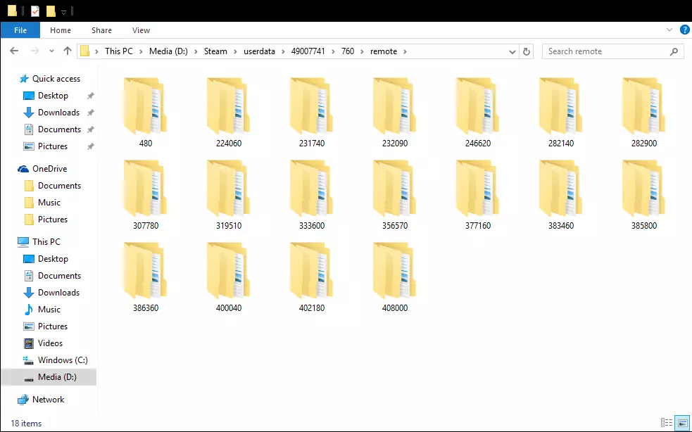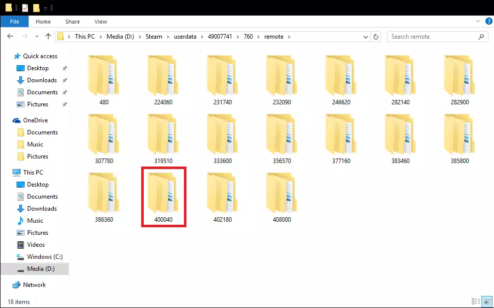 步骤2 现在你到了这里,会注意到一堆以数字命名的文件夹。 这些数字是对应游戏/应用的应用ID。 因此,在这里你需要新建一个文件夹,并将其命名为【400040】。 【400040】是ShareX的Steam应用ID编号。