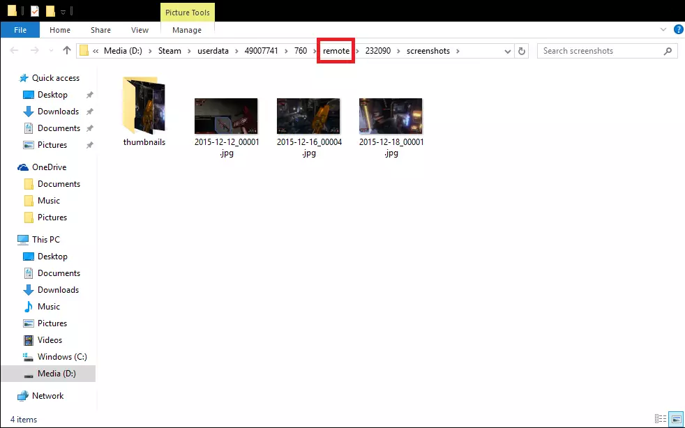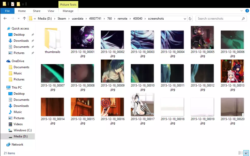 第三步 现在你需要进入“screenshots”文件夹。 你想要上传到Steam的截图需要是.jpg格式。你可以修改ShareX的设置,将截图保存为.jpg格式而非.png,或者使用Photoshop、画图等工具编辑截图并另存为.jpg格式,将其从.png转换过来。 准备好.jpg格式的截图后,将它们放入“screenshots”文件夹。 接下来需要重命名这些截图。文件名必须采用以下格式: 2015-12-18_00001.jpg 文件名中的2015-12-18部分是当前日期。因此,确保截图文件名的这部分与你操作时的当前日期一致(2015-12-18 = 年-月-日)。 00001部分是截图编号。出于明显的原因,同一天不能有两张编号为00001的截图。但如果是不同日期,则可以有两张编号为00001的截图。(例如:2015-12-18_00001.jpg和2015-12-19_00001.jpg)