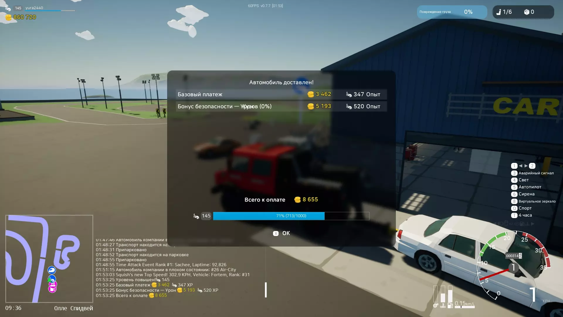 它会随机出现在道路上的某个位置。通常是完好无损的,但有时也会有轻微损坏。你的任务是将其捡起并送到最近的维修中心(目的地标记会自行出现)。这种运输的报酬平均约为5-10k。 2. 汽车运输工作(车辆放置在拖车上)。