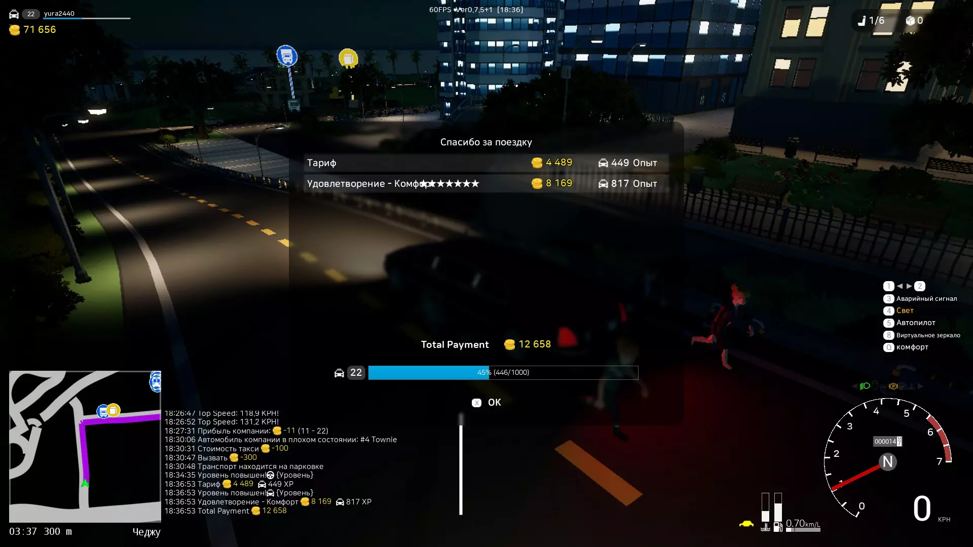 0.7.5版本更新中改进了警局相关功能。现在可进行10次巡逻,而非之前的5次,且巡逻任务出现速度显著加快。因此,现在能赚取更多金钱。当你执行巡逻任务时,每次巡逻会为你增加10%的【相关数值】,但该数值会随时间降低。所以,如果你想从事出租车或公交车工作,需要维持这一数值。当出租车或公交车的巡逻完成度达到100%时,你在这些领域的收入将增加20%。10%的巡逻进度=出租车和公交车收入增加1%,完成第一次巡逻后立即获得11%的收入加成。 为什么完成巡逻会增加出租车和公交车的收入?这是因为城市变得更安全,而人们在安全的城市里愿意支付更多费用。━━━━【出租车司机】━━━━ 需要接送乘客并按照他们的要求前往目的地。可能会有乘客等待特定的车辆。你可以驾驶自己的车辆并将其改装为出租车。 有时,乘客可能会要求平稳驾驶或快速行驶(舒适度和时间)。 出租车控制面板: