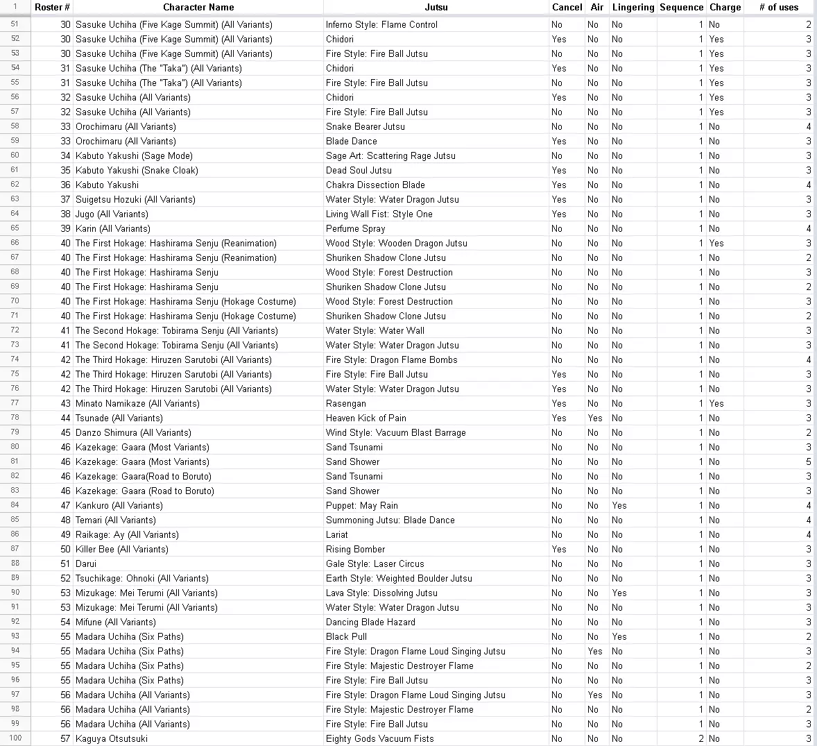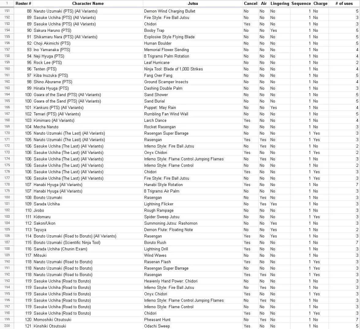 When the game is set to 60 FPS, Jutsu selection lags and causes double input or no input to be registered in the menus. When playing against an opponent with a lower frame rate or a slow connection, the game may run at a much lower frame rate to synchronize the players. This can be avoided by only fighting against opponents with good internet (blue bars). Audio Occasionally, when guard is broken, the audio for the guard break may loop. This looping audio will continue to play until the game is restarted. Occasionally, when an explosion (such as from a jutsu, paper bomb, etc) occurs, the audio for the guard break may loop. This looping audio will continue to play until the game is restarted. Game Breaking On all platforms, if the player is in an online lobby in standby mode (playing offline) and the opponent joins the lobby when the player is clicking 'retry' in the in-game start menu or returning from an offline match to the character select screen/main menu, the game will hang, forcing the player to close the game and restart it. On all platforms, if the player is in an online lobby in standby mode (playing offline) and the opponent joins the lobby with a very slow connection, the game will hang, forcing the player to close the game and restart it. When Audio Output changes, the game may crash. If a mic is not turned on before the game starts, the game will fail to grab the mic. This remains true if a headset mic is turned off when the game starts. If the game is minimized while accepting an invitation to a private game, the controller may not respond. On PC, If the controller disconnects, the controller may not respond when reconnected. This may be due to Windows changing the "player" of the controller when it is reconnected. Using mods online may cause disconnections or crashes. This may not always be apparent to player not using mods, so the game may appear to crash for no reason. It's most noticeable when characters are missing from the 'VS' screen right before the battle, the characters profile image is missing in battle or a specific move always causes a disconnect. During an online match, there may be a 'random' disconnect that occurs when a substitution is used.The issue is caused by a desynchronization between the frame rate of the players and/or system files. A good way to try to fix it, is for both players to validate their files then relaunch the game. Ensuring both players are matching the frame rate is important as well. Personal Training: Find your Power Level! This section will help you find your overall skill level. It will be separated by "tier". Note that this will change depending on what character(s) you choose and which character(s) you choose for the AI. Setting things UpFor a baseline, I recommend using Hinata (PTS) VS. Hashirama (Reanimated). You can use this to determine your overall skill with and against various characters as well. The guide demonstrates this for singles but it can definitely be used in teams as well. # of Matches = 3 Choose Super Hard Choose Max Handicap for CPU Unlimited Time Secret Techniques and Jutsu are forbidden except when your opponent is out of subs. This is due to the AI eating these attacks instead of blocking them or dodging them. This tests mostly: Reaction Time, Combo Skills, Resource Management, Dodging Skills (increased damage means guard is broken easily). This will test more of your aggression/pressuring skills than your defensive skills, simply because the opponent AI doesn't pressure well. This is great for determining personal skills with each character. Formula and Tier ListFormula: Power level = Health Ryo Score + Time Ryo Score Tier List Be honest with yourself. Find your lowest score, highest score and average score. Use the average score to determine which tier you fall into, but be careful to notate your lowest and highest scores and try to make them more consistent with your average score. S+ Tier: Score > 7,250 (Highest possible is around 7,500) S Tier: 6,750 - 7,250 A+ Tier: 6,250 - 6,750 A Tier: 5,750 - 6,250 A- Tier: 5,250 - 5,750 B+ Tier: 4,750 - 5,250 B Tier: 4,250 - 4,750 B- Tier: 3,750 - 4,250 C+ Tier: 3,250 - 3,750 C Tier: 2,750 - 3,250 C- Tier: 2,250 - 2,750 D+ Tier: 1,750 - 2,250 D Tier: 1,250 - 1,750 D- Tier: Score < 1,250 E Tier: Losing = Not ready for online. AI Issues AI will move around aimlessly and not attack. This can be prevented by being aggressive. The AI does not block or evade attacks, will continuously spam the tilt and forwards/backwards dashes and uses barely (if any) of the mechanics used online. This is a primary reason this guide is so important and it's also why this training method should be considered a baseline - not a full indication of your skill level. Chances are however, if you score really high here you'll do well online. DemonstrationHere is a demonstration of this personal training in action: Tutorials: Character Guides This section is dedicated to character guides. All characters are in the same order you'd find them in the roster. From left to right, Pages 1-5 (Left to right). Character Guide Completion: 100/128(78.125% - Missing 28 characters) Note: It is unknown what the percentage is for awakened characters, but I suspect it is quite a bit lower. Character VariantsKeep in mind, that some characters have different variants. A "variant" is any character of the same name with a different moveset that shares the same roster slot. The exception to this rule is Itachi, who takes up two roster positions, but the second roster position is just a skin and not a variant. Otherwise, characters who share the same name, but take up different slots, are treated as individual characters. Variant List: Page 1 (27+4) #004A = Naruto (Tailed Beast Bomb) #004B = Naruto (Sage Art: Massive Rasengan Barrage) #004C = Naruto #007A = Kakashi (Double Sharingan) #007B = Kakashi (Great Ninja War) Page 2 (27+3) #040A - Hashirama (Reanimation) #040B - Hashirama #043A - Minato (Reanimation) #043B - 