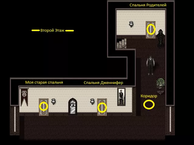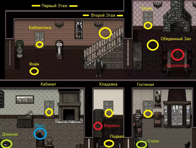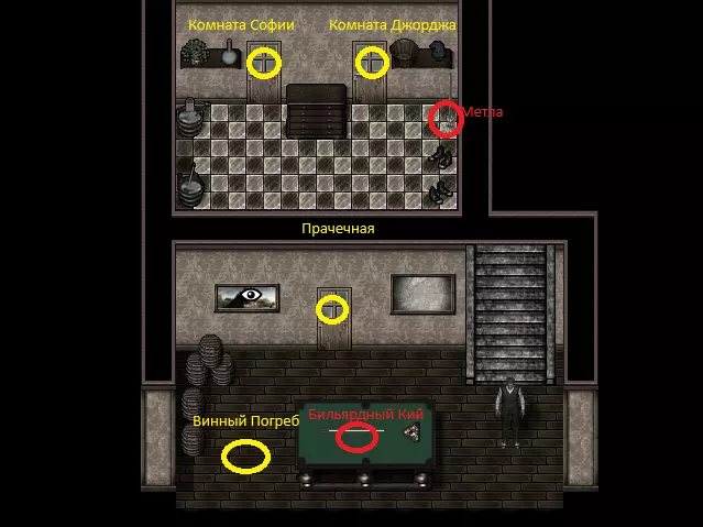 杀死妹妹以获得遗产。制造意外事故,或者陷害他人。 别墅地图 - 一楼 其实别墅的布局并不复杂,但我决定具体展示物品的位置。至少这有助于更快熟悉游戏并记住物品的摆放位置。