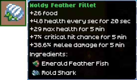 (2) 发霉羽毛鱼排——这两种鱼都能为近战伤害配置提供5分钟的增益效果。霉菌鲨鱼是所有鱼类中最容易大量捕获的(在霉菌水域中有50%的概率),翡翠羽毛鱼也不算难(在阿塞奥斯荒野的普通水域中有24%的概率)。因此,你完全可以用这种食物来帮助对抗强大的怪物(例如霉菌地牢)以及 bosses。 翡翠羽毛鱼提供的7%额外暴击率将提升平均DPS输出,支持暴击配置,并与近战技能树天赋【迅猛狂暴】产生协同效应(更多的攻击次数意味着更多的暴击机会)。因此,在游戏后期(剧透),它将有助于触发【雷霆光束】灵魂(击败阿塞奥斯后获得)。