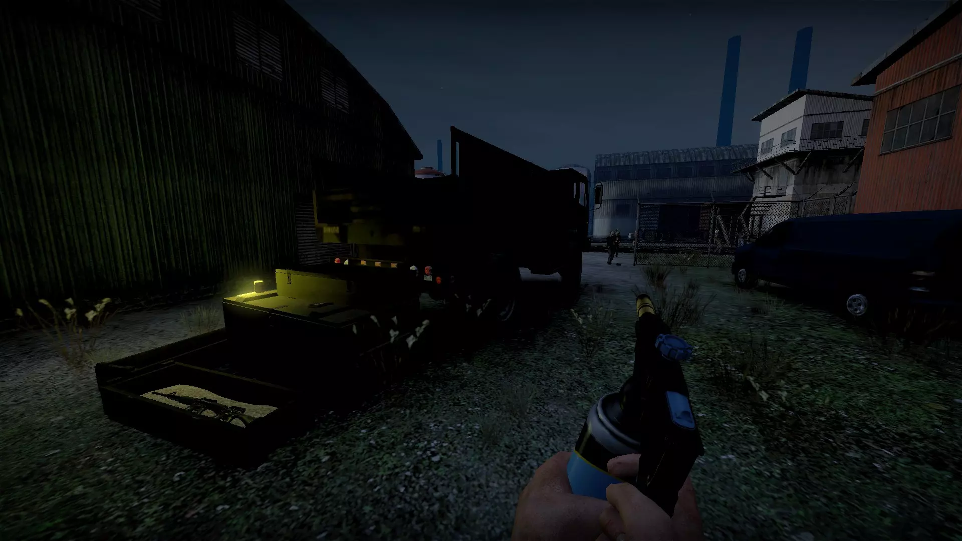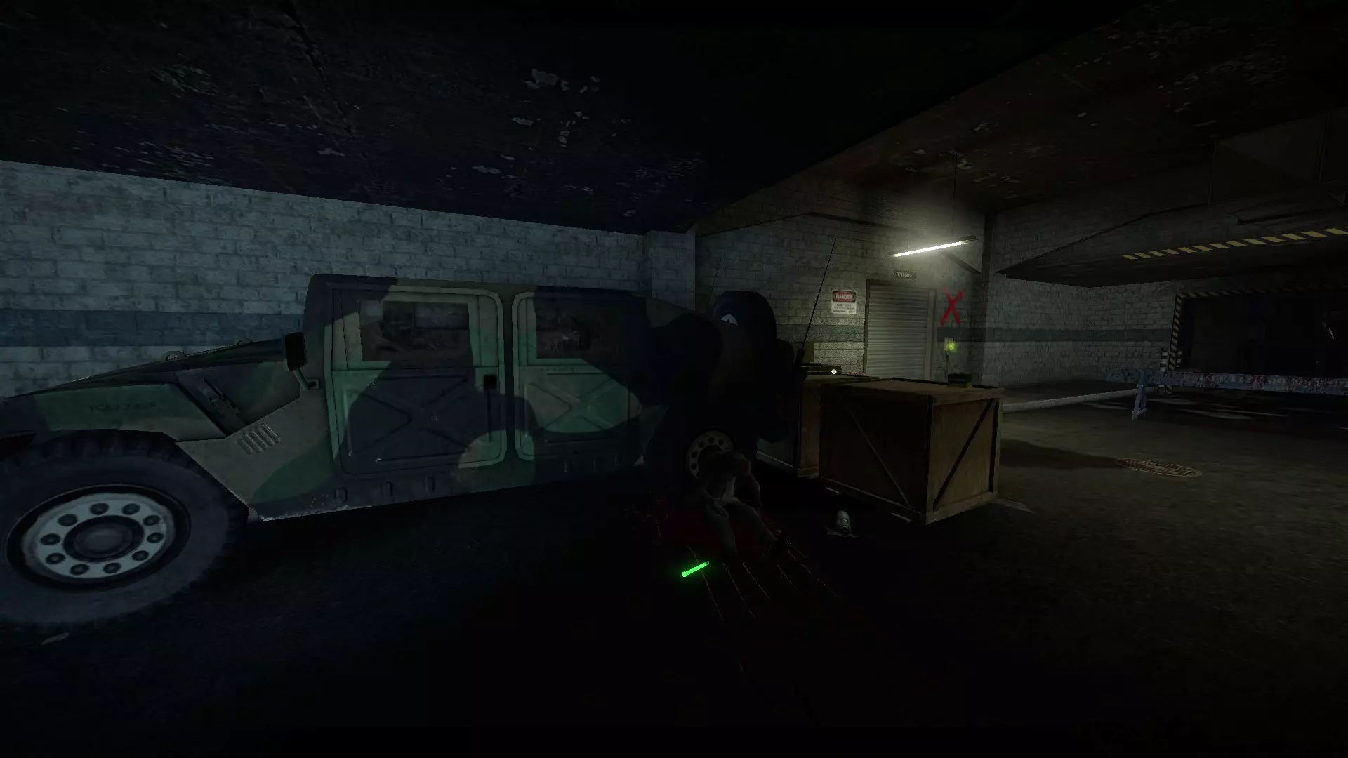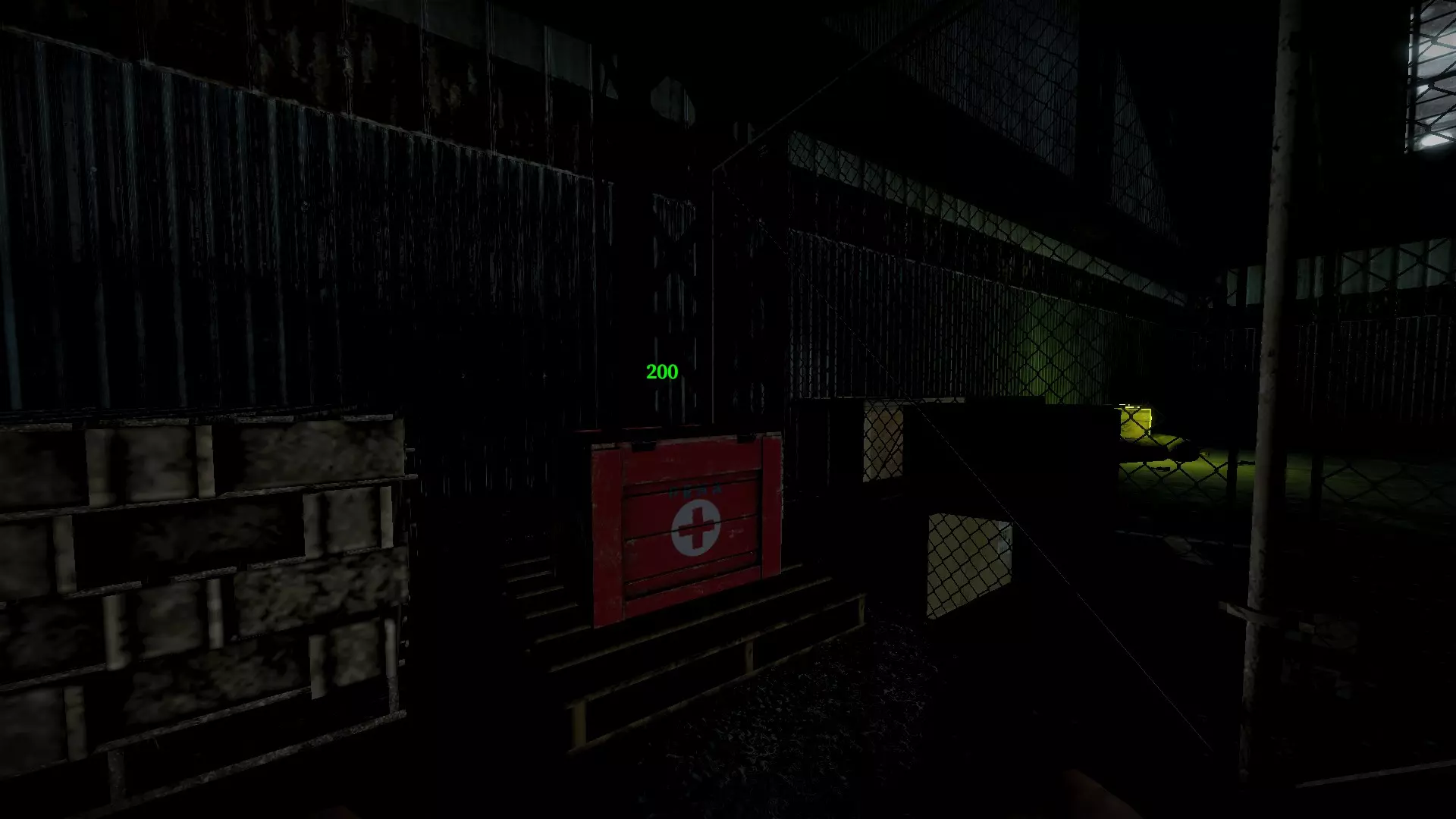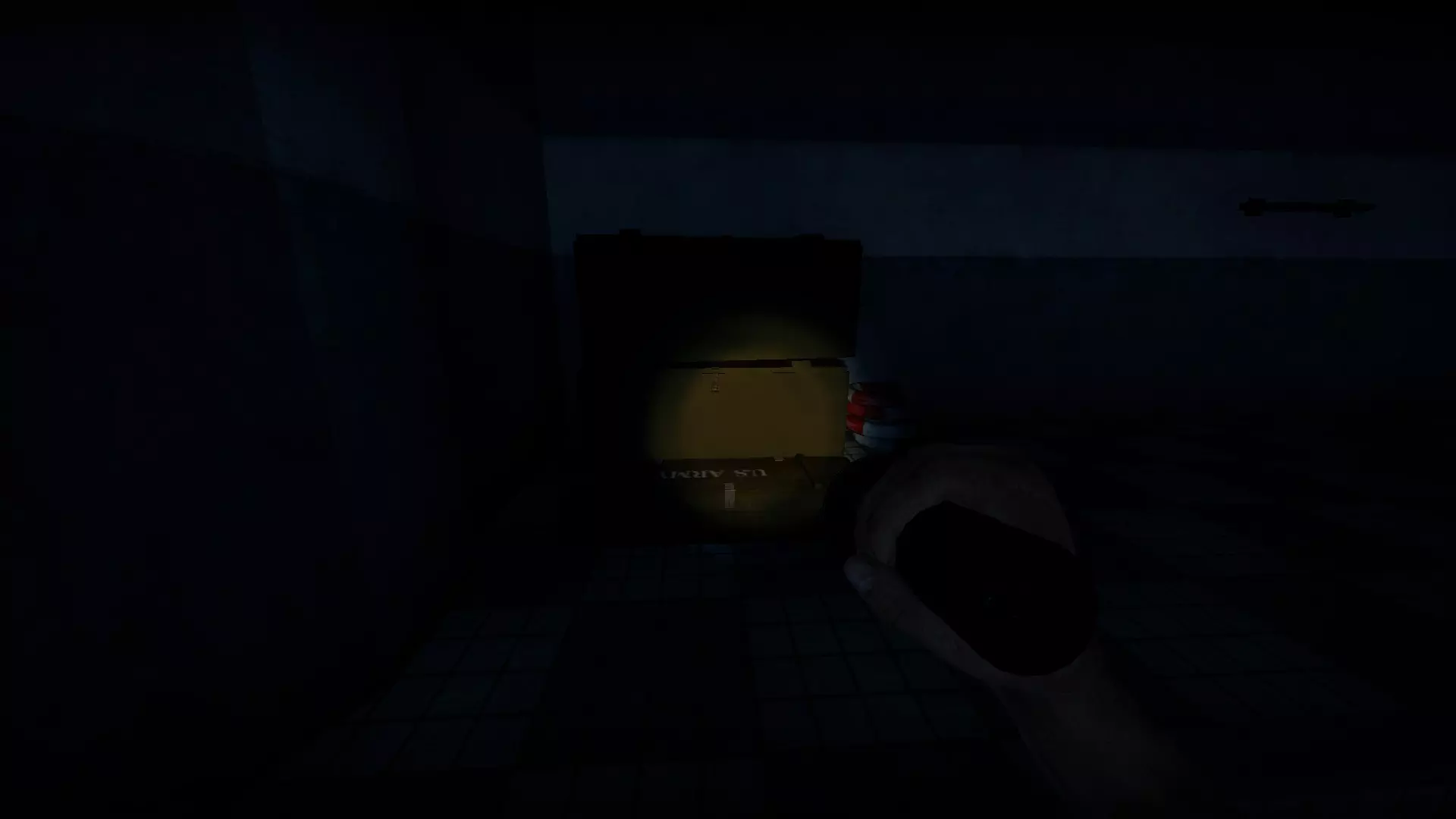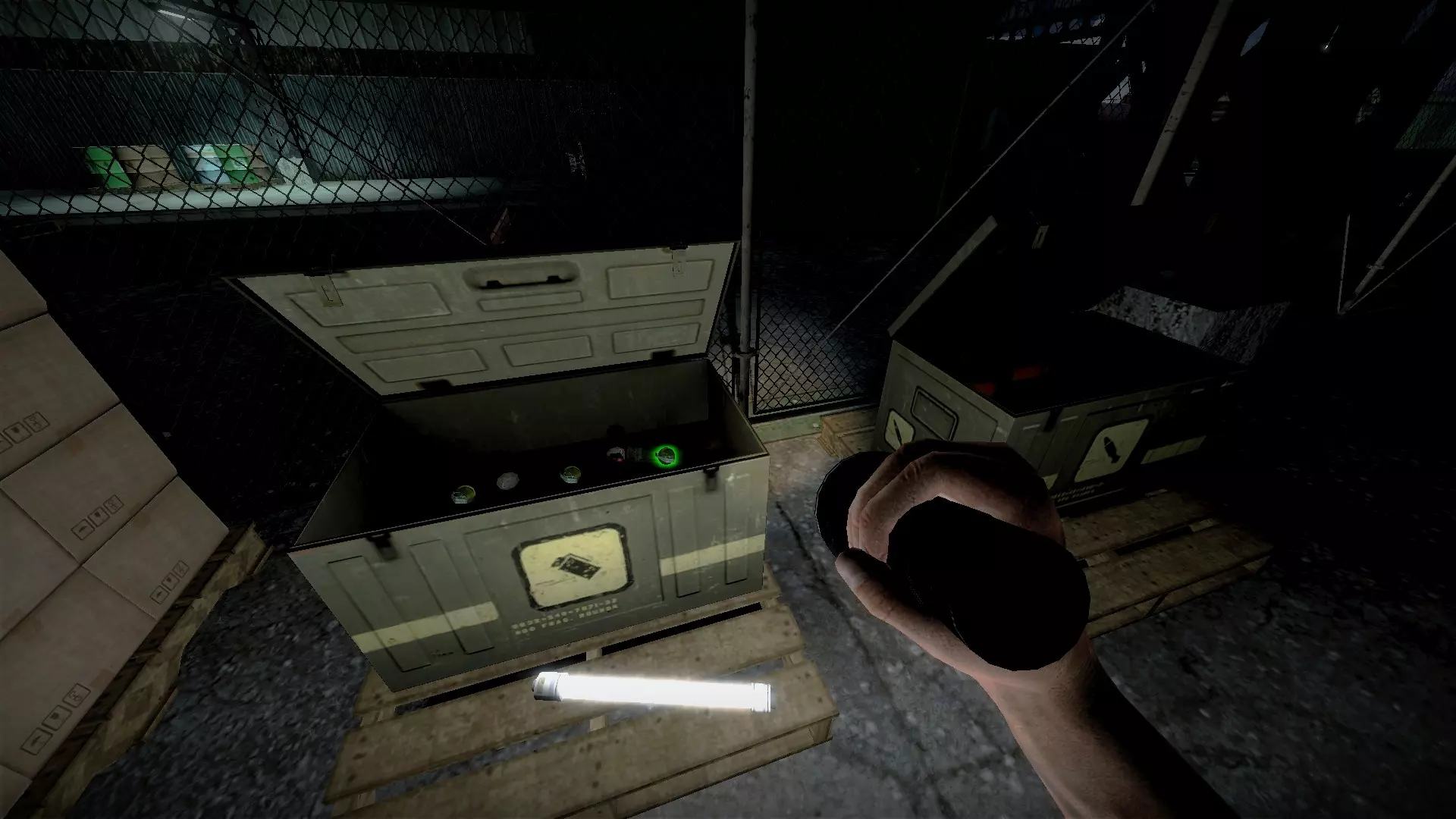在仓库中,向三个军用箱子下方的托盘射击,箱子就会掉落并裂开。其中一个箱子旁边有一个医疗箱。这些箱子里会有药品、 firearms 和爆炸物。信号枪