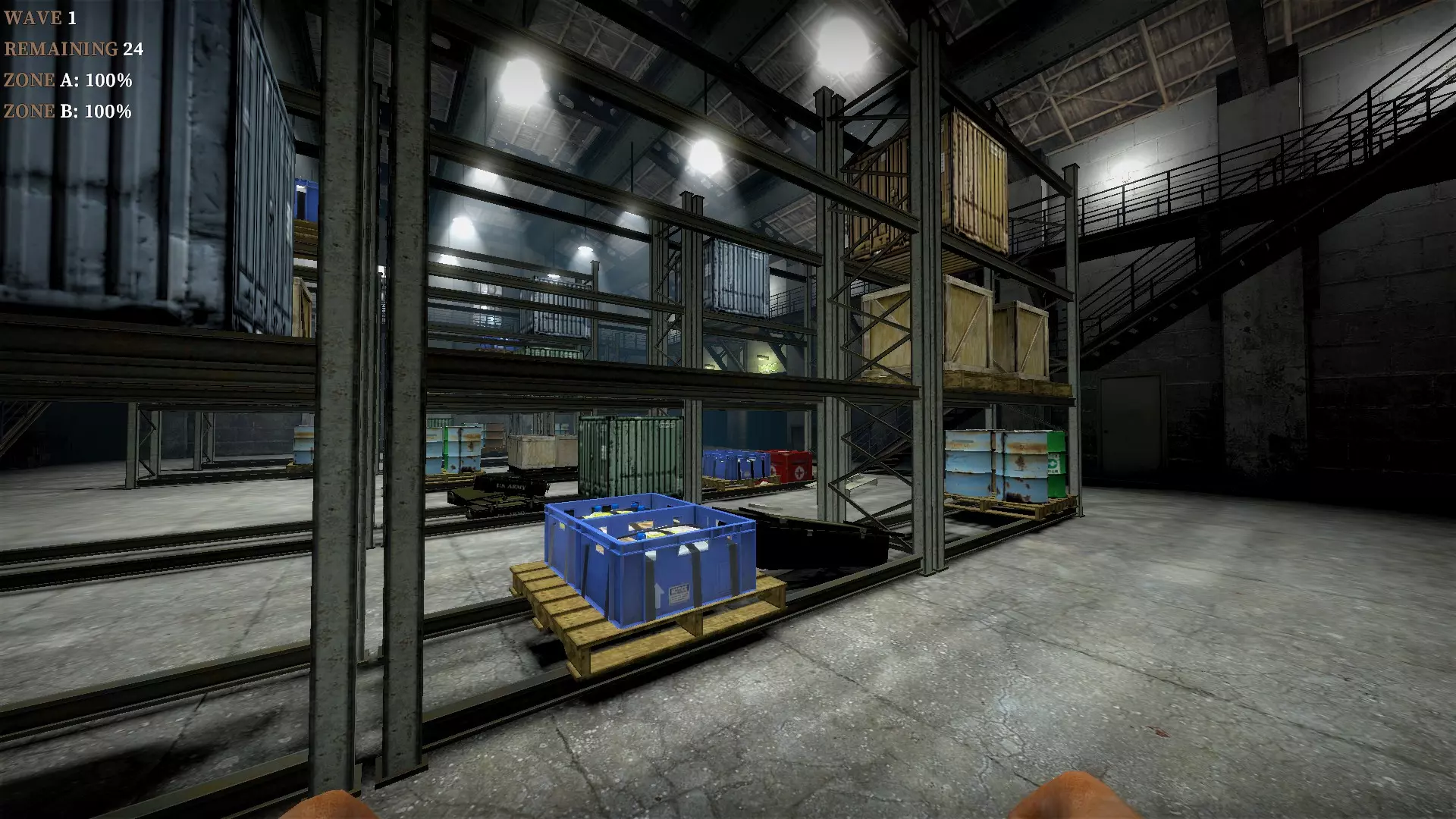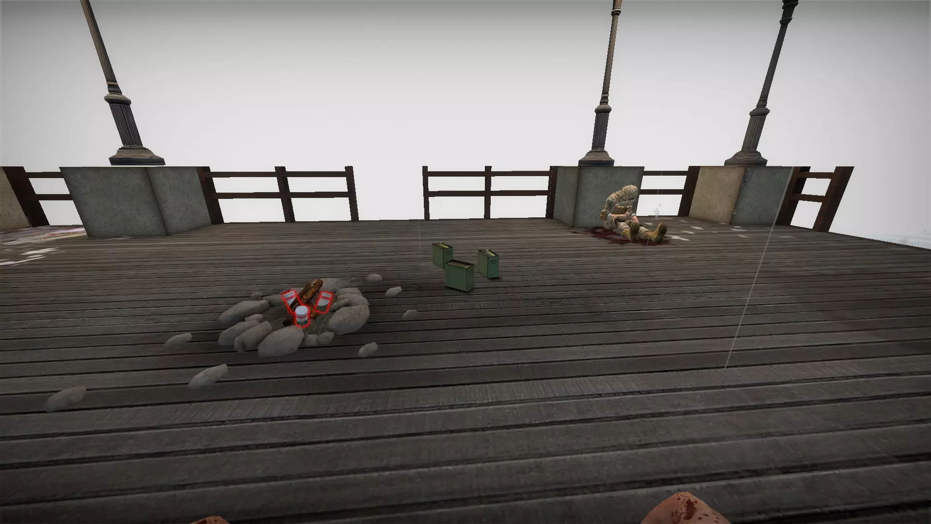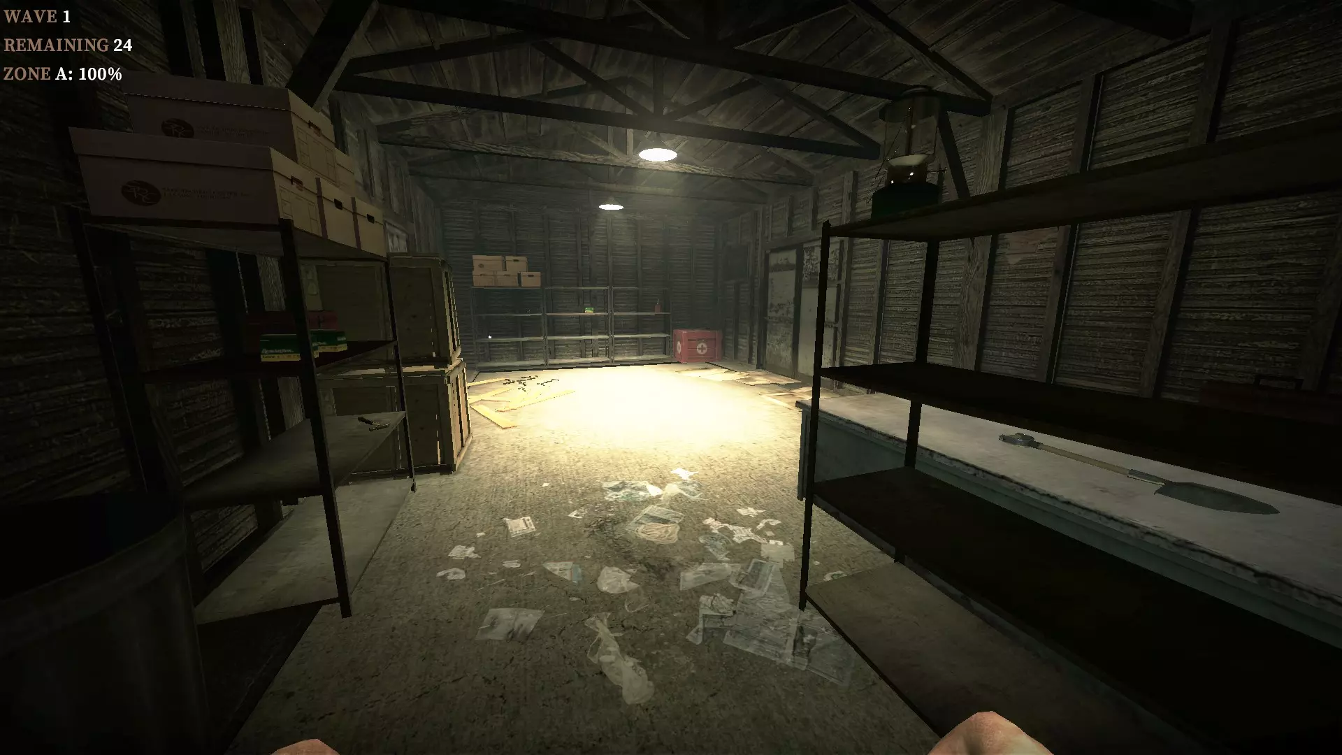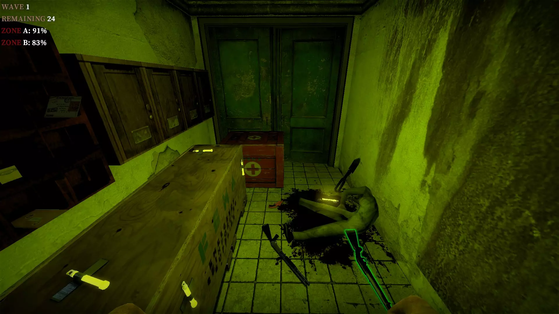 在仓库中,向三个军用箱子下方的托盘射击,箱子就会掉落并裂开。其中一个箱子旁边有一个医疗箱。这些箱子里会有药品、 firearms 和爆炸物。信号枪