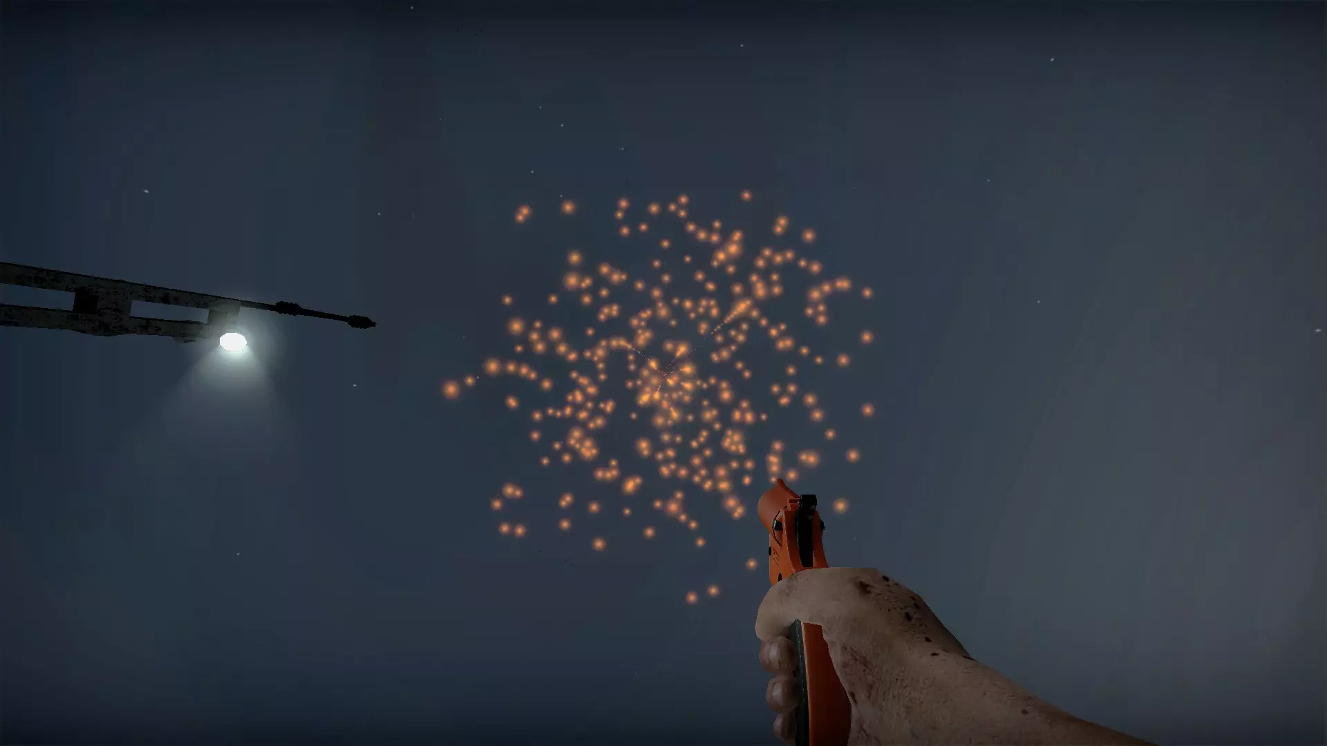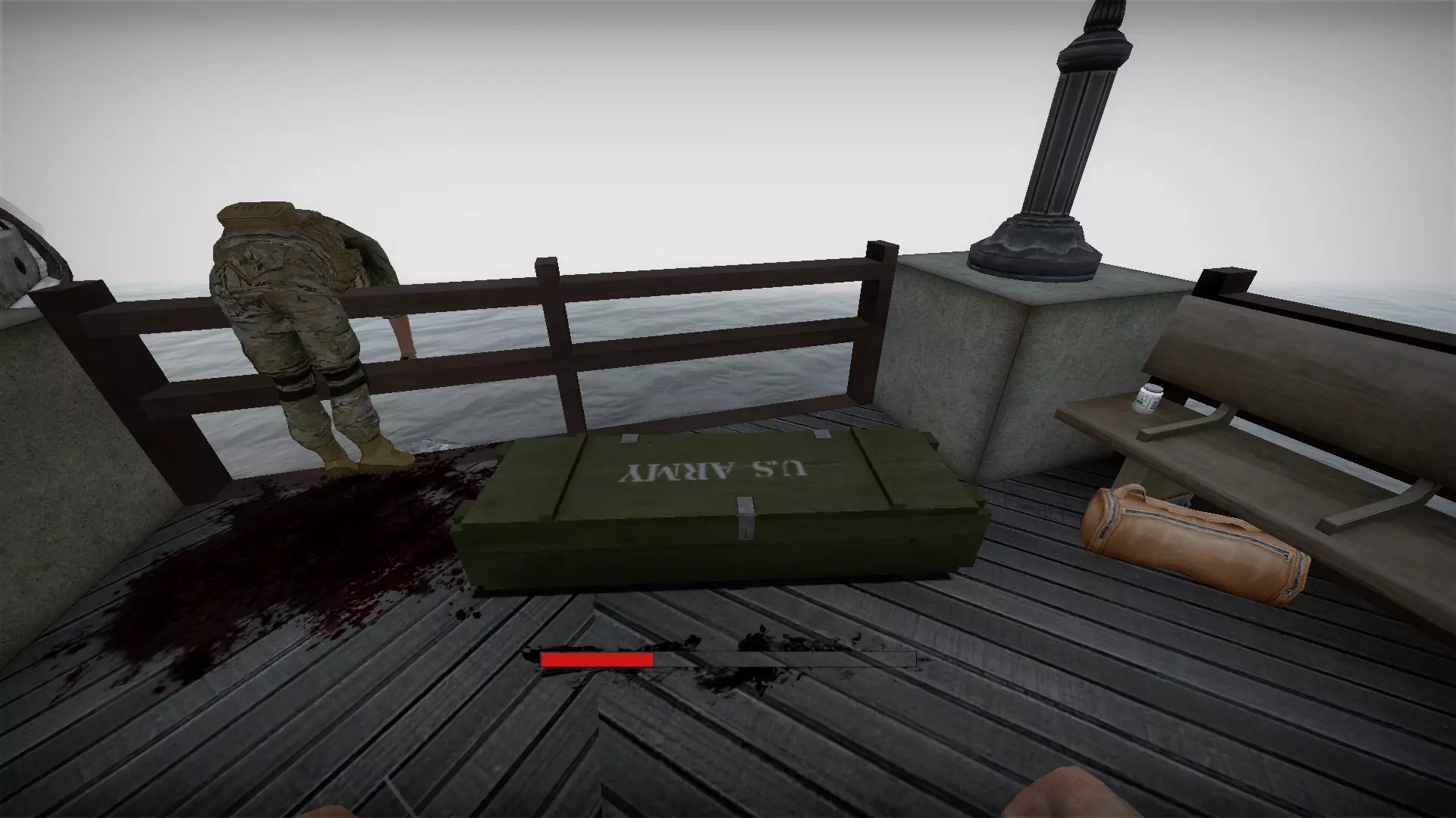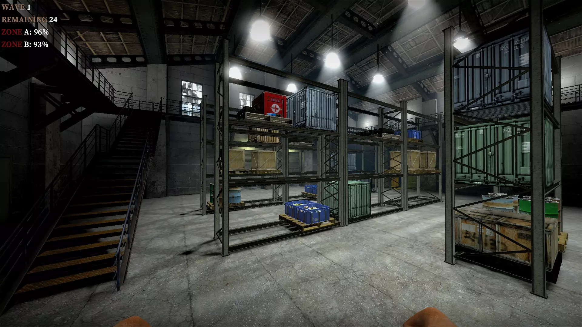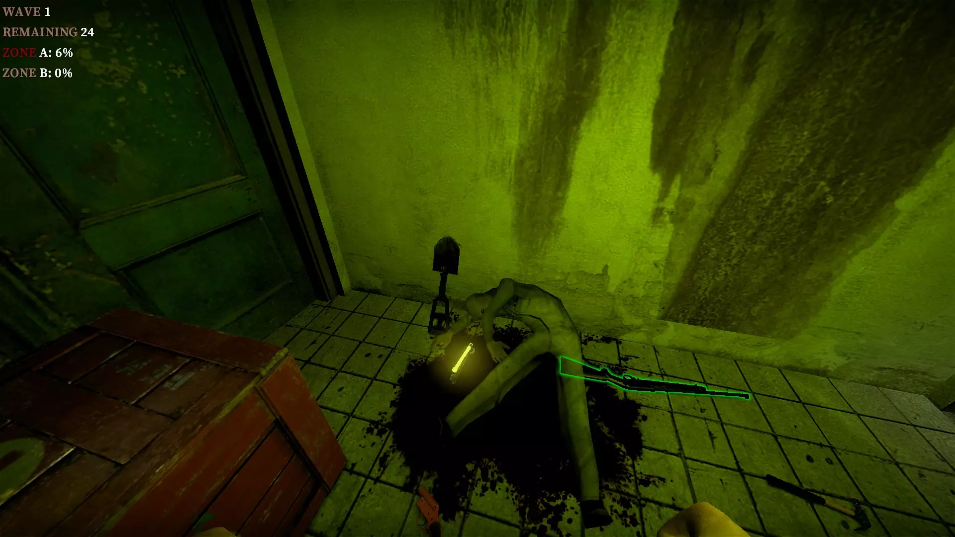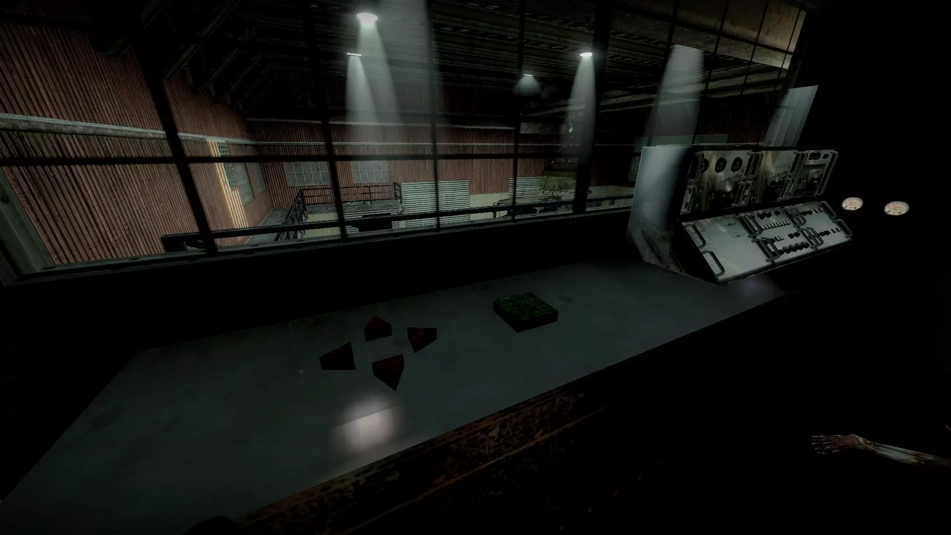 在仓库中,向三个军用箱子下方的托盘射击,箱子就会掉落并裂开。其中一个箱子旁边有一个医疗箱。这些箱子里会有药品、 firearms 和爆炸物。信号枪