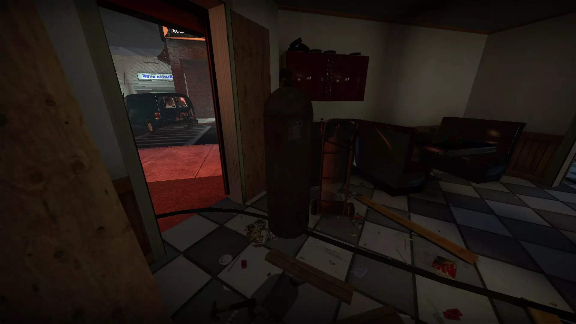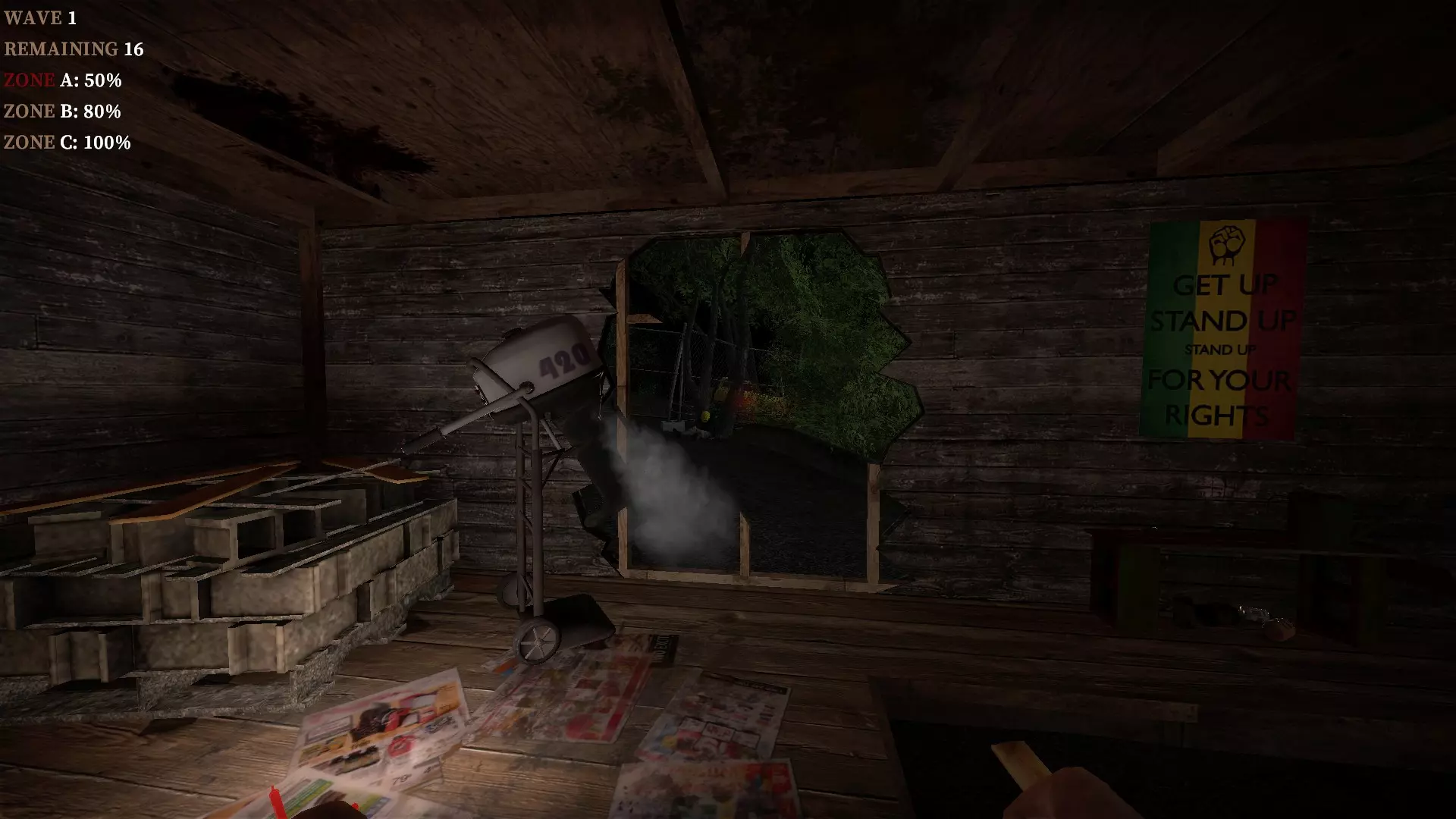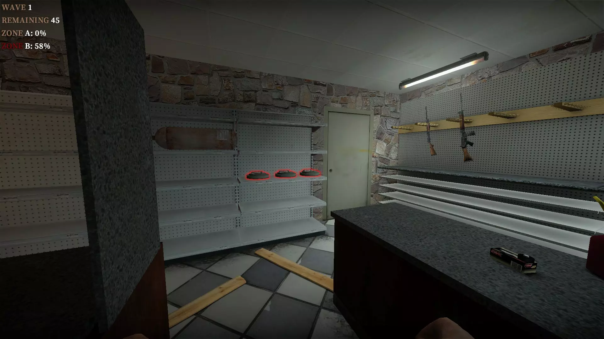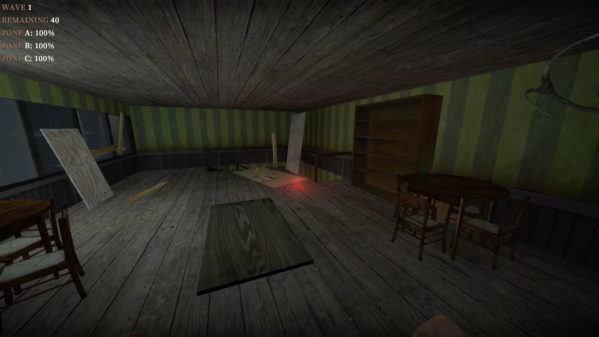 如果你找到穿过商店的路,可以用我的进阶技巧来取下五金店锤子上的木板。装备 barricade hammer( barricade hammer),按住1打开物品栏,按E卸下木板,然后右键点击物品栏中的锤子将其丢弃。这样你就能保留木板并扔掉锤子。如果你尝试按U再按G,这个方法是无效的。