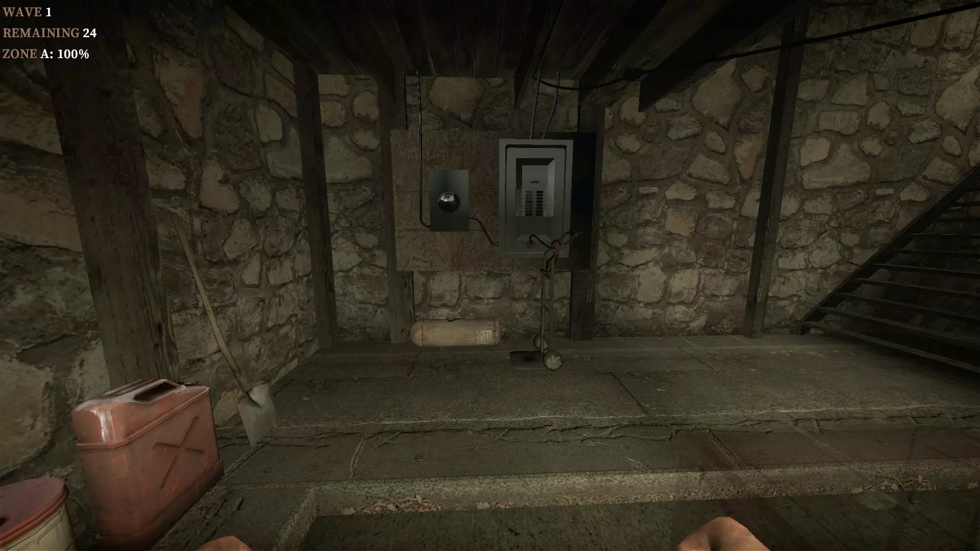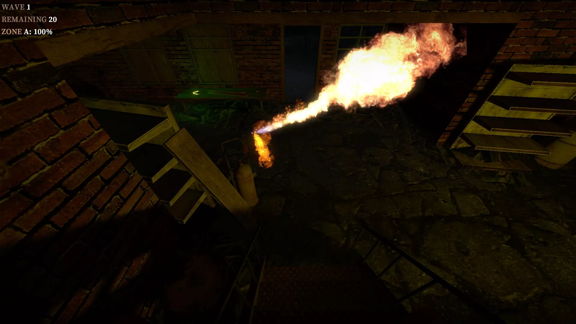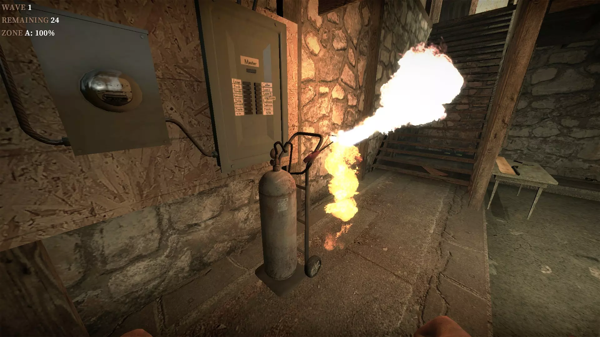 在地下室按住E键使用丙烷罐,以焚烧从楼梯下来的僵尸
