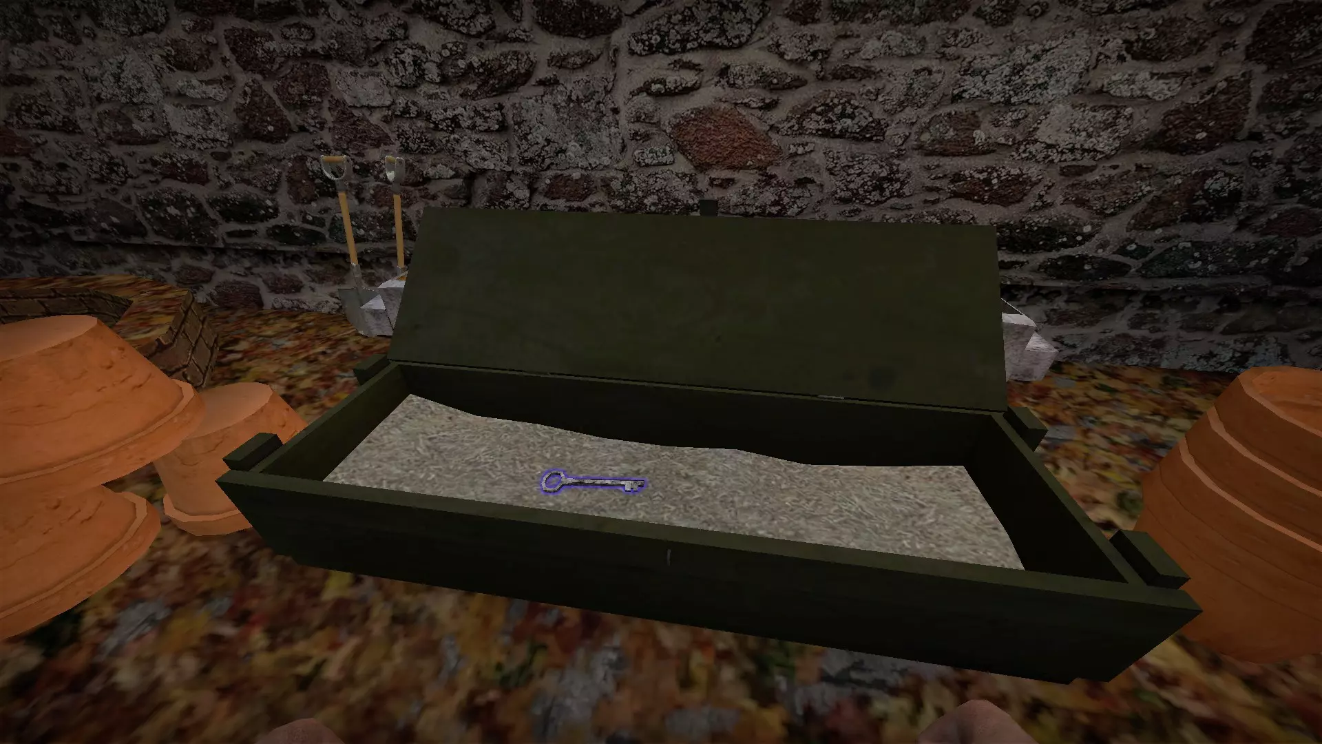 墓地里有8盏灯笼在燃烧,地下室钥匙会出现在其中一盏灯笼附近生成的尸体旁。钥匙没有发光效果,也不会显示在罗盘上。