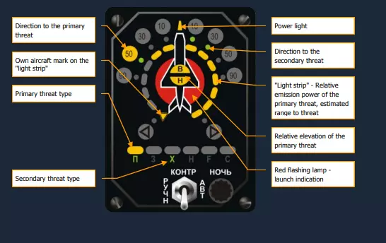高度表:用于测量高度。 襟翼和起落架指示器:水平条显示襟翼是否放下,圆圈显示起落架是否放下,垂直条显示减速板状态。 姿态指引指示器:显示航向、横滚和俯仰角度。 空速表:显示飞行速度。 迎角指示器和过载指示器:指示器左侧显示迎角(单位:度),右侧显示过载值。 平视显示器(HUD):显示航向、横滚、俯仰角度以及所选武器。 斯科尔相机(Skhal Camera):用于引导空对地武器系统。 燃油量指示器:左侧垂直条显示燃油状态,右侧垂直条显示供油油箱状态。 雷达告警接收机系统(RWR System)