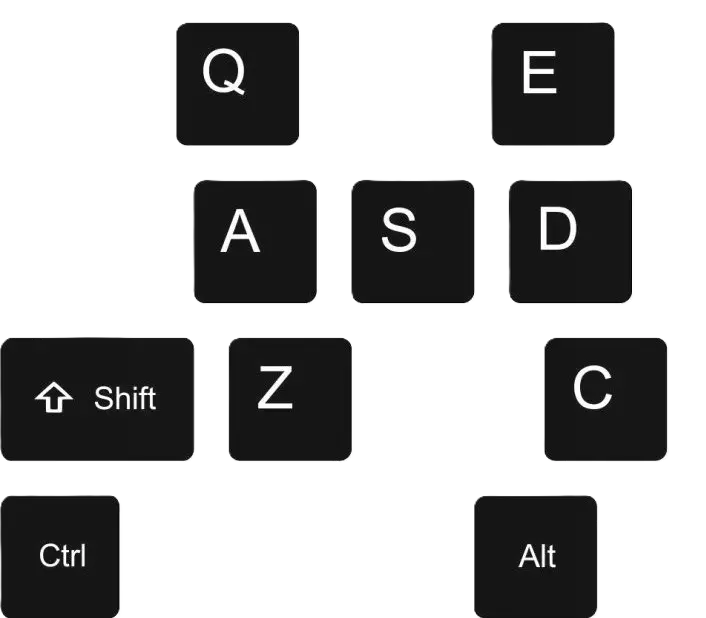 按住Shift键后,可以方便地向两侧“转动视角”以扩大视野,具体操作按键如下: 向左旋转视角:Z 向右旋转视角:C 重置视角至中心:鼠标中键