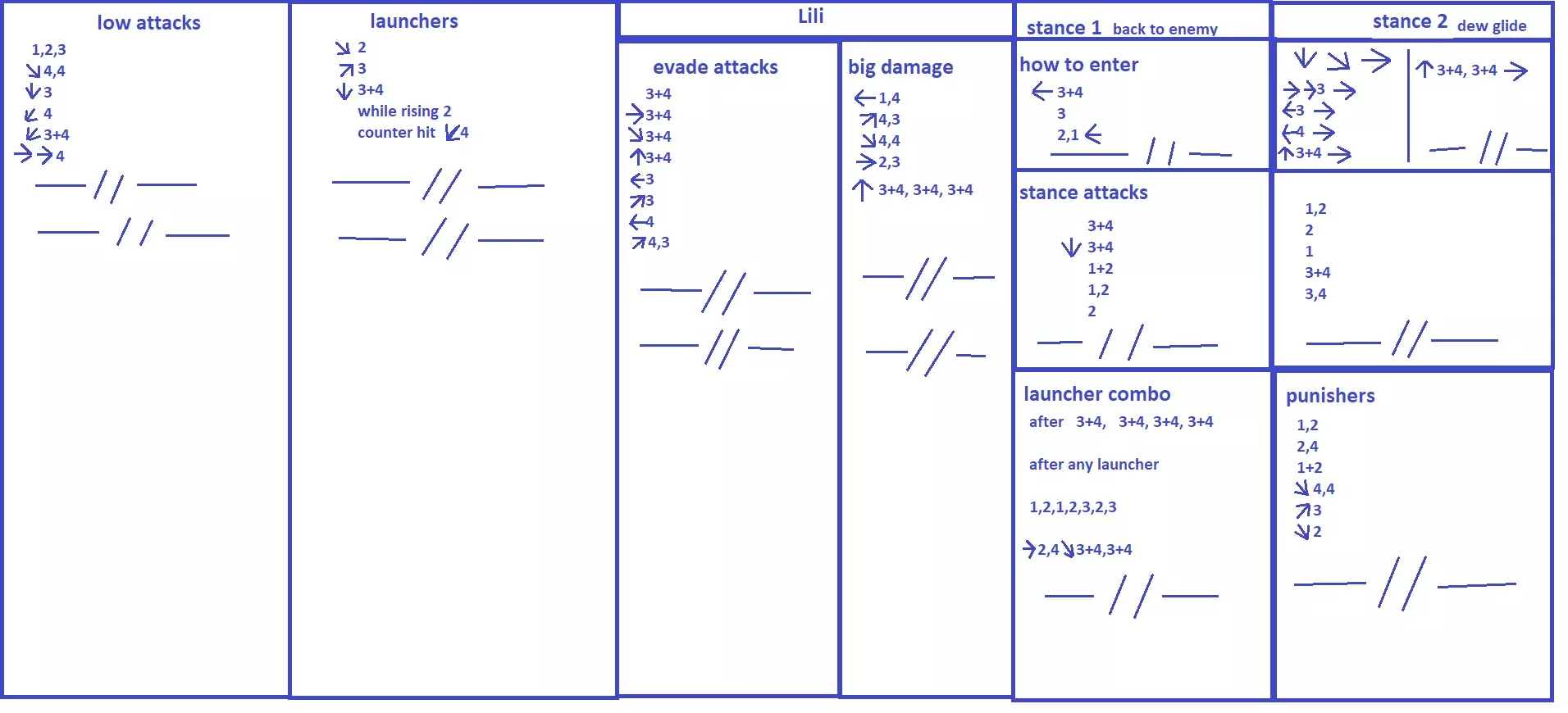 Attack levels There are 3 of them – high, mid and low. High attacks usually fast, long and/or do lots of damage, but if character stands in a block, he will block a high attack, if he sits, a high attack will miss, so they hard to land. Mid attacks usually a bit slower and shorter than high, but there are a lot of launchers among them, and they penetrate sitting block. Launchers can lead to powerful juggle combos, so the main block in Tekken is standing block, which protects from mid attacks. Low attacks often use as poke – they can deal damage to a standing opponent and make him want to do something besides standing and blocking. Also, check this guide http://web.tekken-net.org/tk7/images_lang/english/common/pdf/torikore.pdf Throws Another way to prevent your opponent from standing and blocking is to throw him. You can find all throws your character have in a move list.Every character has at least 3 of them with 1+3 and 2+4 - they do 35 damage and can have extended range by pressing forward, also they do more damage if you catch enemy from side or back. They may be interrupted by pressing 1 and 2 accordingly. Also, each character has 1+2 (and some direction) throw, it deals 40 damage from a front and more from sides or back, can not be extended and can be interrupted with 1+2. King throw break Attack range It is important to know the exact range of your attacks. Don’t use long range attack when an opponent is close to you. Also think, how opponent moves, if he moves away, he tries to make you whiff your attack. If he comes to you, you may use your attack even if opponent not yet in range, he will come in range by himself. If you don't know your attack range https://www.youtube.com/watch?v=hyGoTLy5qw4 And BTW - top 15 moves to every character https://drunkardshade.com/2017/05/27/tekken-7-top-15-moves-for-all-characters/ Frame data If you don't know what on Earth frame data is, watch this video. https://www.youtube.com/watch?v=45Iqxq9svZQ watch it either way, it's good. and this https://www.youtube.com/watch?v=JwQ8J8iAOLs You can check frame data here http://rbnorway.org/t7-frame-data/ and here http://poorvin.com/t7.txt and here on steam http://steamcommunity.com/sharedfiles/filedetails/?id=938186839 It is important to know how fast or slow each of your attack is. Don’t use slow attack when an enemy can beat it with his fast attack. Also, you must know how much – frames each of your attack is on a block. Don’t spam attack which has a lot if – frames on block or whiff. Also, you may use an attack which + on block more often. Almost any attack have + frames on hit. So if you received damage, no matter, how small, you probably on frame disadvantage and it may be wise not to attack after you receive damage, wait a bit, to block or dodge something and get frame advantage, then it’s your turn to attack. Also, learn your punishers – which attack you can use to punish opponent Your hitbox during attacks Many attacks in Tekken makes your character crouch, jump or deviate back. These attack may allow you to dodge enemy attack (jump vs low attack, crouch vs high, deviate may help vs mid). So attacks which make your character reduce his hitbox somehow definitely good for attacking an opponent. https://www.youtube.com/watch?v=jwzOqBvvgaE Launchers Launchers – attacks which make your opponent fly, or stun him. After that attacks you can do juggle combo. You may find them in frame data http://rbnorway.org/t7-frame-data/ they marked as "Launch" in "Hit frame" section. "Hidden" launchers - some attacks of your character become launchers on counter hit. Which is definitely good since there are more options to do juggle combo for you. You may find them in frame data http://rbnorway.org/t7-frame-data/ they marked as "Launch" in "Counter hit frame" section. Counter hit launchers are often easier to land so make sure you know which attack of your character launches on counter hit and learn, how to follow up it with a combo. The game has screw attacks (marked green in a move list and "Tail spin" in frame data list), they allow you to extend juggle combo by landing another attack after you land a screw attack. Simple juggle combo may look like this: Launcher - screw attack - combo finisher a bit more complicated version launcher - some attack - screw attack - dash forward - combo finisher for example https://www.youtube.com/watch?v=uAYrM2wYp7U&index=1&t=301s&list=LLXz3JIFJwNZSKXvx7WuQmlw Combo finisher may be almost any attack your character have and even Rage Art. Doing Rage Art as combo finisher is a good way to deal huge damage without big risk, so learn, how to do it in a practice mode. Launcher - screw attack - Rage Art example https://gaming.youtube.com/watch?v=VSO8BwNn-P4&feature=share You may invent your own juggle combos or find it in move list or in character guides. Just create some easy sequence which you personally like to do, it may be even just 2 same move strings. If it deals something about 50 damage, it's great for a start. Later you may want to extend this combo when you get familiar with juggle concept. Simple combos ideas are here https://www.youtube.com/playlist?list=PLeEk_GDSnydYwPax0IATKf_x5WXYKTwBc Landing a launcher may be a tricky task because many of them are punishable if blocked (but some not launcher punishable). Usually, you want to make opponent whiff (by back step or side step) to land a launcher. Some launchers are also made your character jump, or crouch, which can be used if you expect a low or high attack from an opponent. Fast launchers can be used as punishers. Doing launchers and juggle combos definitely will help you to win more matches. Learn, how you can land each of your launchers, and follow them with combo each time. Chain attacks Often what you may find in character's move list is not a true combo. Mean opponent may block last attack even if first and second hits. These move sequences are good for tricking your opponent, instead of finishing tha