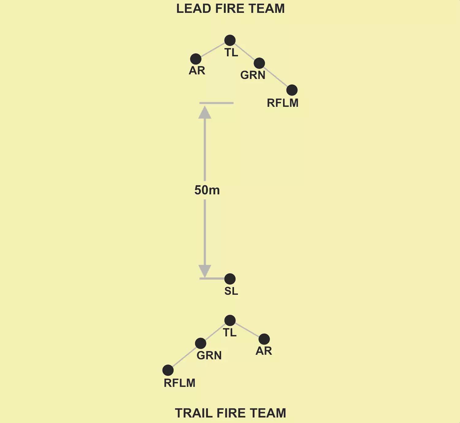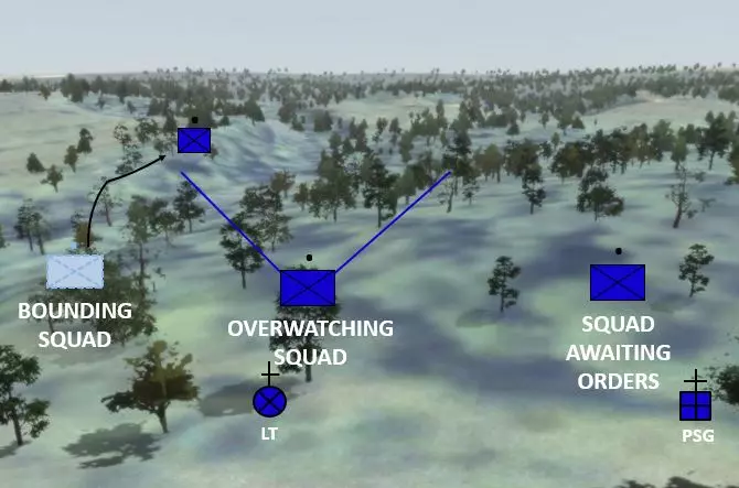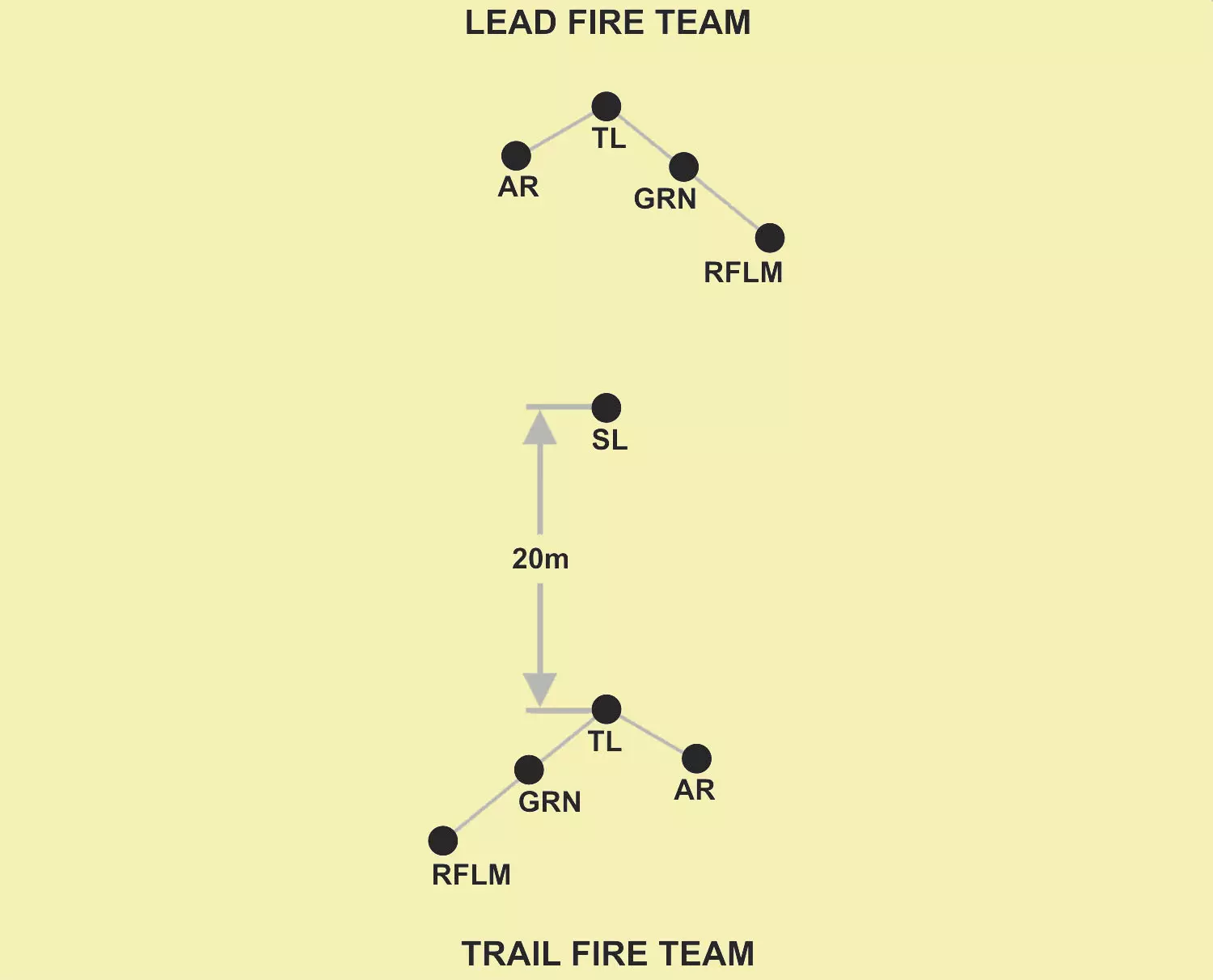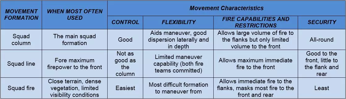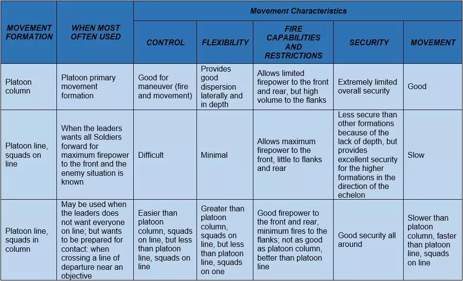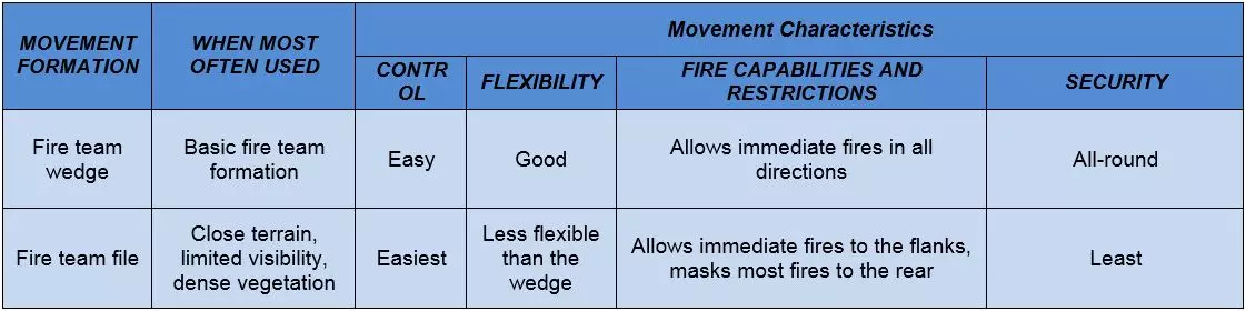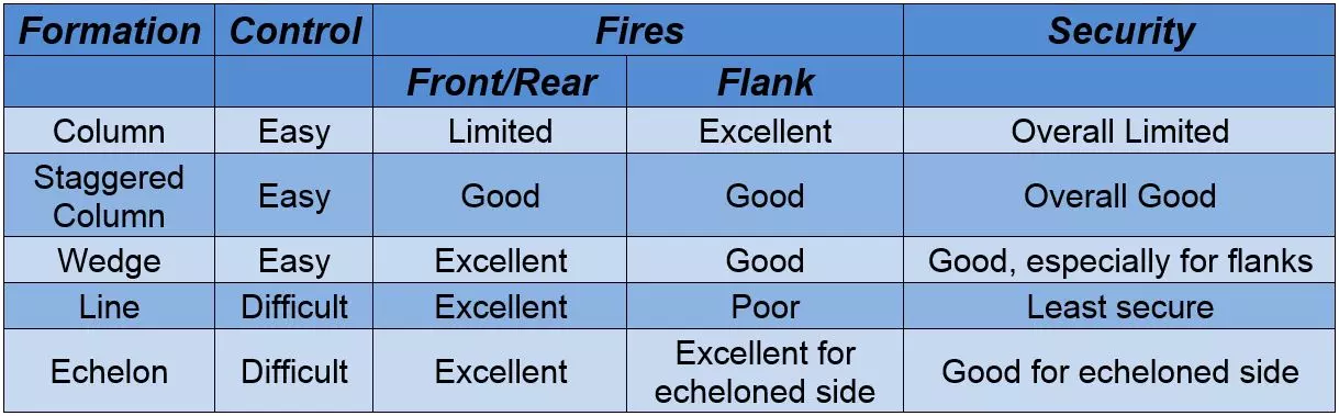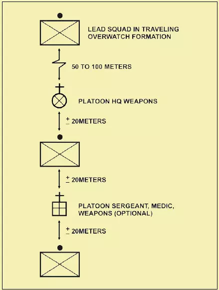 七种战斗阵型可分为两类:单前锋阵型和多前锋阵型。多前锋阵型通常更有利于在正面取得火力优势,但控制难度较大。相反,单前锋阵型更容易控制,但在正面火力优势方面表现欠佳。 横队、梯队和纵队是七种阵型中灵活性最差的。横队在正面集结大量兵力,但侧翼较为脆弱。梯队专为应对侧翼威胁而设计,这是部队希望避免的情况。纵队则难以支援处于交火状态的单位。使用这些阵型的指挥官应考虑降低其整体灵活性不足所带来的风险。 战斗移动: 移动技巧并非固定阵型。它指的是士兵、小组和小队之间的距离会根据任务、敌人、地形、能见度以及其他影响控制的因素而变化。 移动技巧有三种:行进、掩护行进和跃进掩护。移动技巧的选择基于与敌人接触的可能性以及对速度的需求。每种技巧需要考虑的因素包括控制、分散、速度和安全性。个人移动技巧包括高姿匍匐、低姿匍匐,以及从一个掩蔽位置向另一个掩蔽位置进行三到五秒的快速移动。 火力小组队形 火力小组队形包括楔形队形和纵队队形。 团队领导者以身作则:“跟我来,照我做”。 团队成员根据团队领导者的移动方式进行移动(如向右/向左移动等)。 楔形队形中士兵之间的“标准”间隔通常为10米。