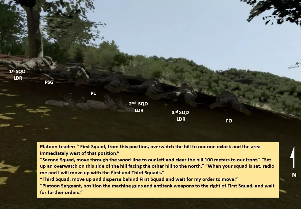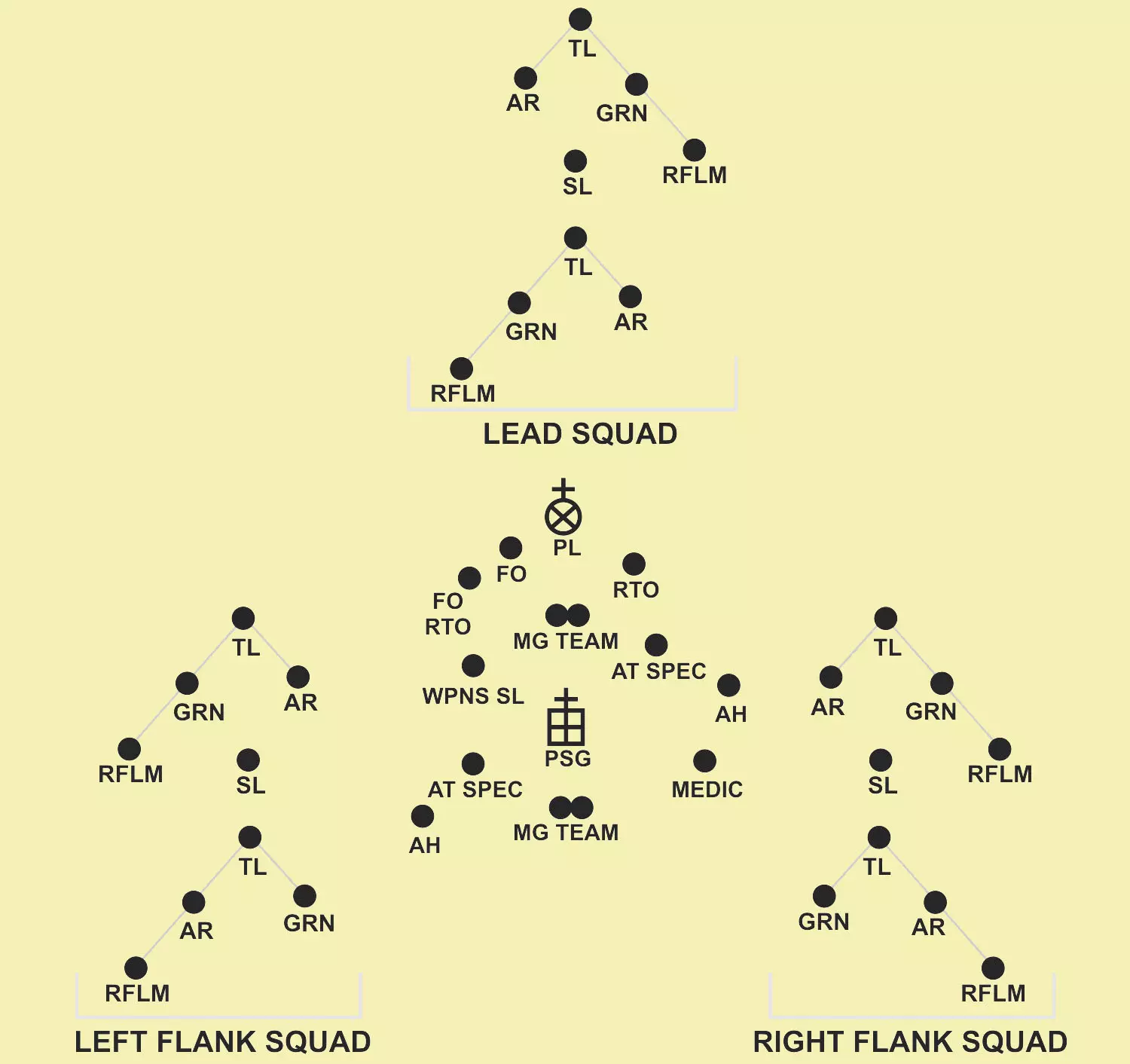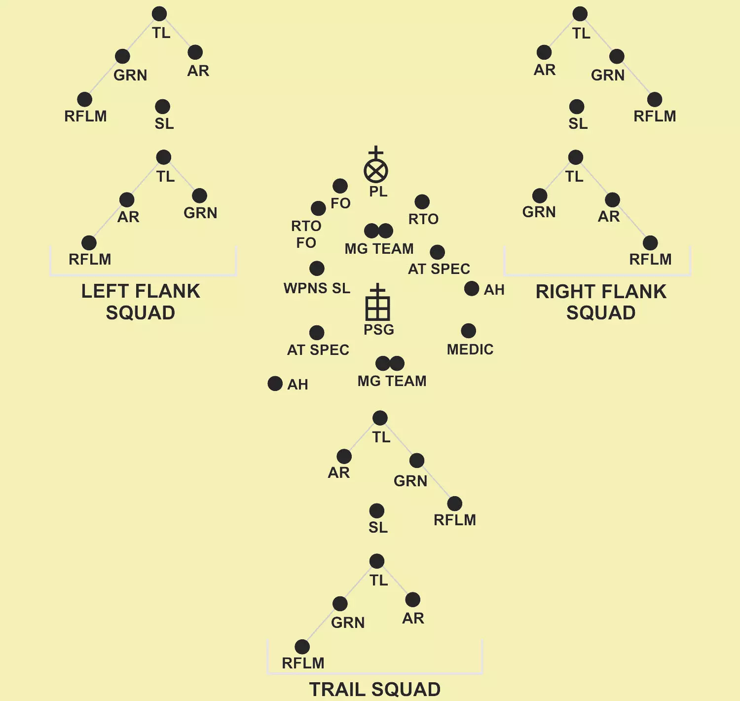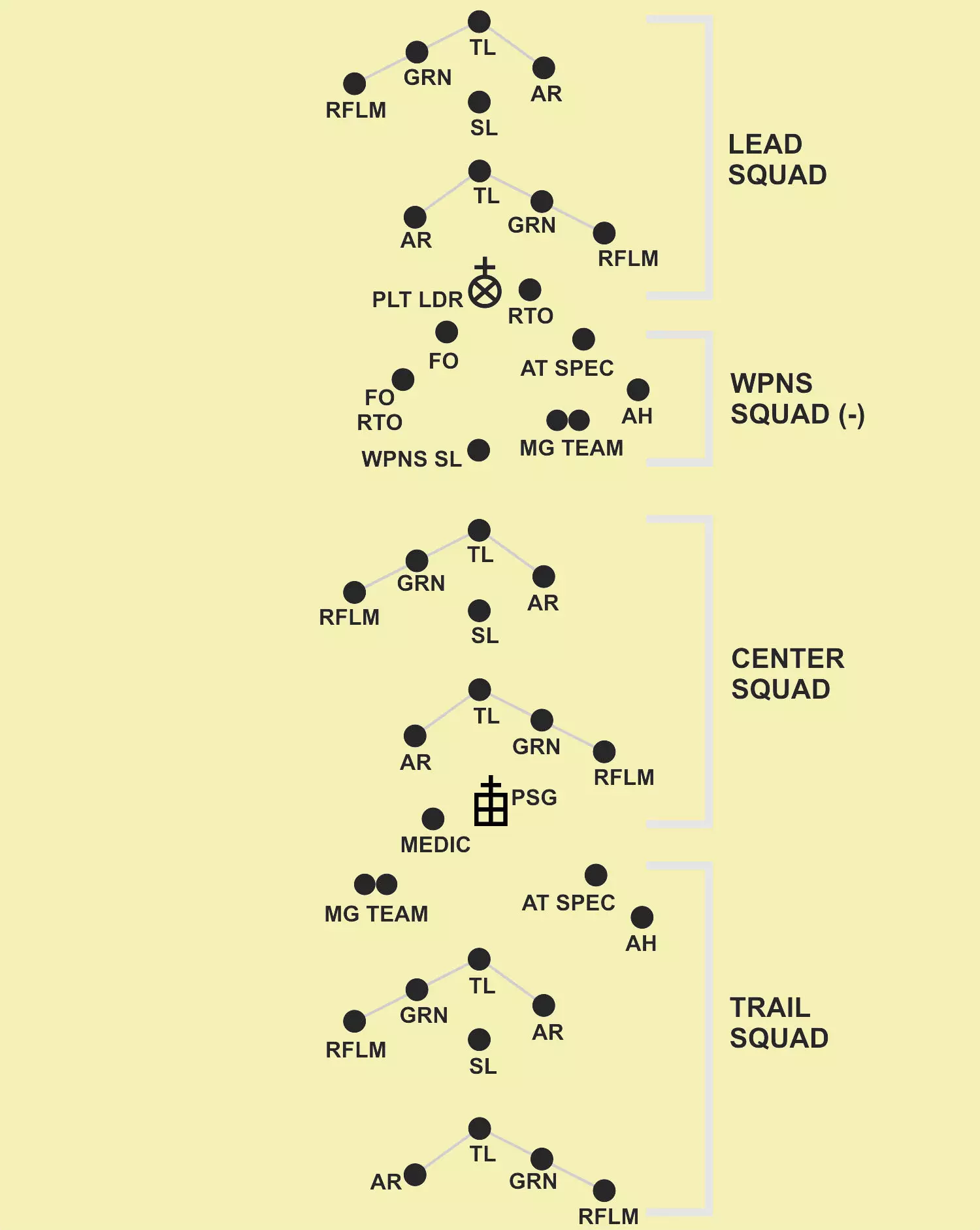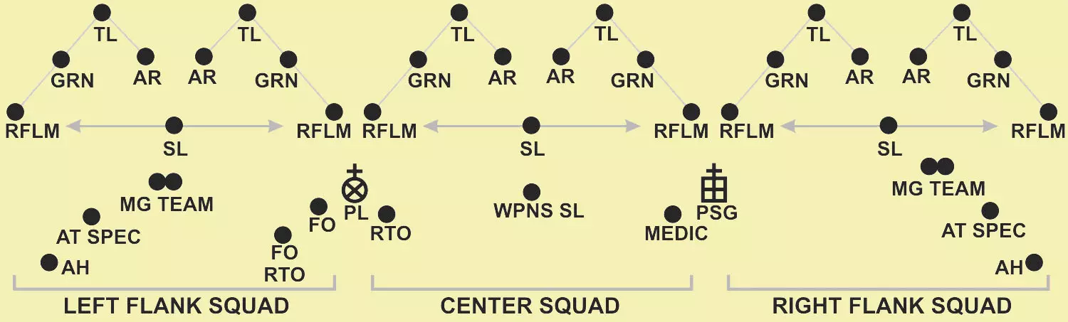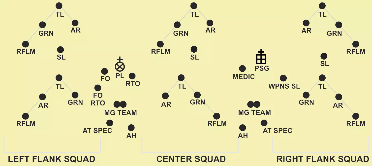 PLT文件,文件内包含3个SQD(含火力TM);楔形队形中的领先火力TM;1个SQD负责侧翼警戒(每侧1个火力TM),火力TM呈楔形队形。通常仅用于“行进”状态。 乘车排队形:“乘车时,排采用纵队、楔形、横队、梯队、环形和人字形队形”。一般来说,乘车机动与徒步机动遵循相同的队形和注意事项。此外,乘车机动使用独特的手旗信号和旗帜信号来传达命令。