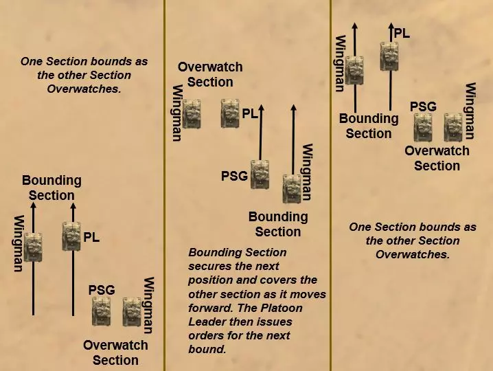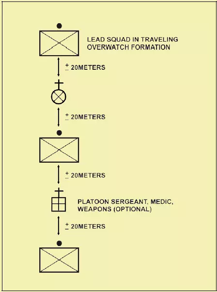 跃进掩护 下车排移动队形 "行进时,指挥官通常将部队分为两组:警戒分队和主力。在大多数情况下,步兵排和班的规模不足以将兵力分为独立的警戒部队和主力部队。不过,可以通过采用移动战术来完成这些警戒功能。" "移动战术是排穿越地形的方式" 当不太可能发生接触且需要速度时,排通常采用行进战术