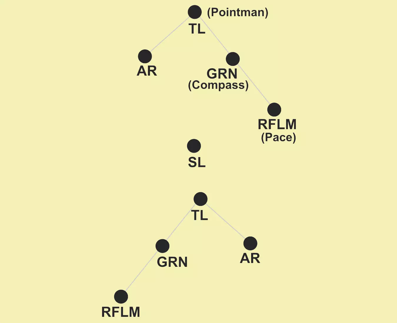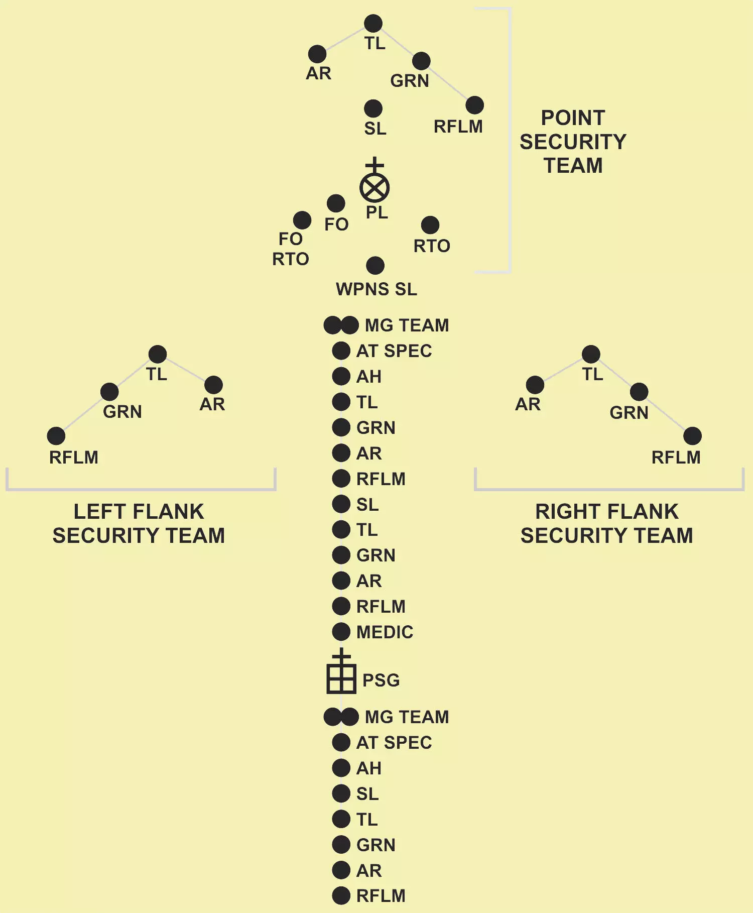 注意火力小组组长(TM LDR)的位置应靠近突击步枪手(AR),以便更好地控制他们的行动。 班组队形: 班组队形指的是火力小组之间的相对位置(2个火力小组组成1个班组)。 班组队形包括:班纵队、班横队和班一路队形。 班组组长(SQD LDR)使用这3种基本移动战术,并通过2名火力小组组长进行控制。 班组组长可以指定1个火力小组作为“火力基地”,另1个火力小组向前移动。当班组配属有机枪小组(MG TM)(或反坦克/防空等小组)时,尤其适用此战术。在班组移动过程中,班组组长及所有配属单位(机枪/反坦克/防空/前沿观察员/近距离空中支援等)位于2个火力小组之间。 注意: 描述班组移动时,应先说明火力小组的队形,再说明班组队形。例如:“火力小组呈楔形,班组呈纵队”。