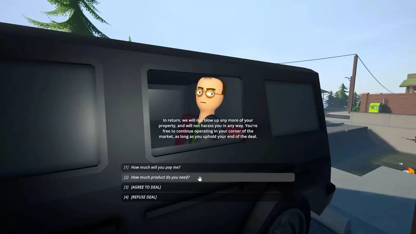 如果你使用的是旧存档,可能不会自动收到此消息。默认情况下,你只会被标记为敌对状态。无论如何,你想观看过场动画吗?打开控制台并输入:setqueststate unfavourable_agreements 1 黑色SUV出现在停车场。走近后,托马斯·本齐斯会进行自我介绍。他并不含蓄。他告诉你是他的家族炸毁了你的房车(没错,就是他们干的),现在他向你提出一个交易。 出现两个选项。就这样,没有协商的余地。 交易:你应该接受还是拒绝? 托马斯希望你为他工作。接受意味着: 如果你接受(休战): - 你将被限制在北镇和西维尔地区 - 无法扩展到这两个地区之外 - 每周必须向海兰庄园交付2-3次产品 - 你将获得批发价格(约为市场价值的一半) - 不会有伏击,不会有针对经销商的抢劫 - 永远无法解锁可卡因(该物品在码头区域被锁定)