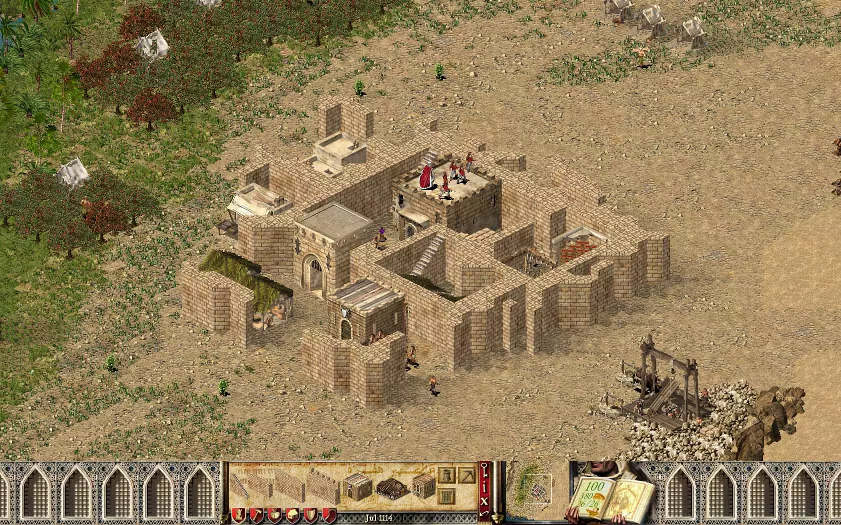 第三步 兵营与工坊 我们将兵营放置在离敌人最远的一侧。我们只需要4到5个工坊。长矛与弓箭的生产比例应为2:2。也可以采用2:3的比例,但这种情况下弓箭应占3份,因为弓箭的制作速度较慢。另一种可行策略是设置4到5个弓箭生产点,然后从市场购买长矛。 最后一步 城墙建造 由于粮仓和军械库已被围住且只有一个入口,接下来我们应该用城墙将城堡主楼本身围起来,并在营火前设置一道城门。其他所有建筑都将位于城堡外部。兵营和市场需要用城墙进一步加固,以保护它们免受投石机的攻击。矿场周围不需要任何围墙,房屋也应建在城堡外部,工坊可根据需要进行加固。