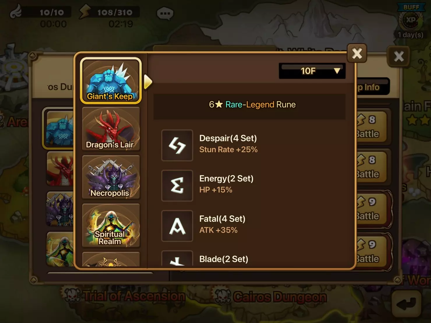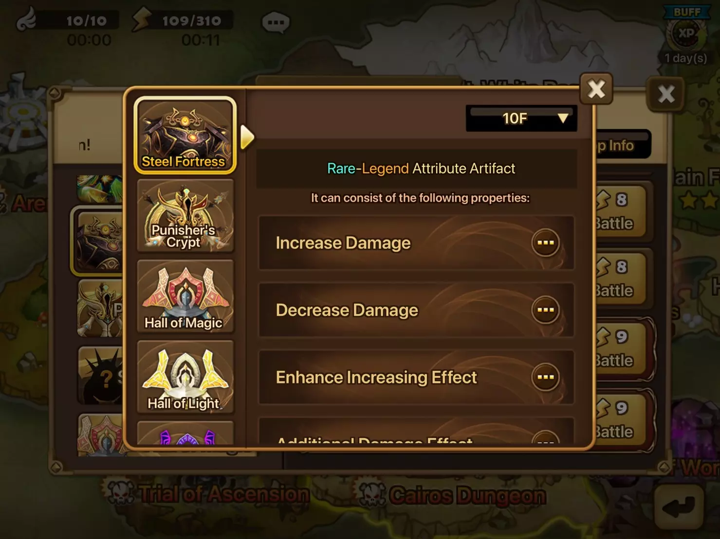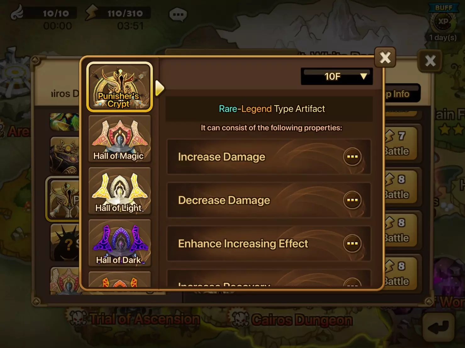• 通过网关的重复战斗功能,你可以一键连续进行多场战斗。重复战斗可连续进行10场或30场,该功能适用于你已通关的地下城。 • 重复战斗进行期间,你可以游玩其他内容,如竞技场和攻城战,也可以管理你的魔灵、符文和神器。