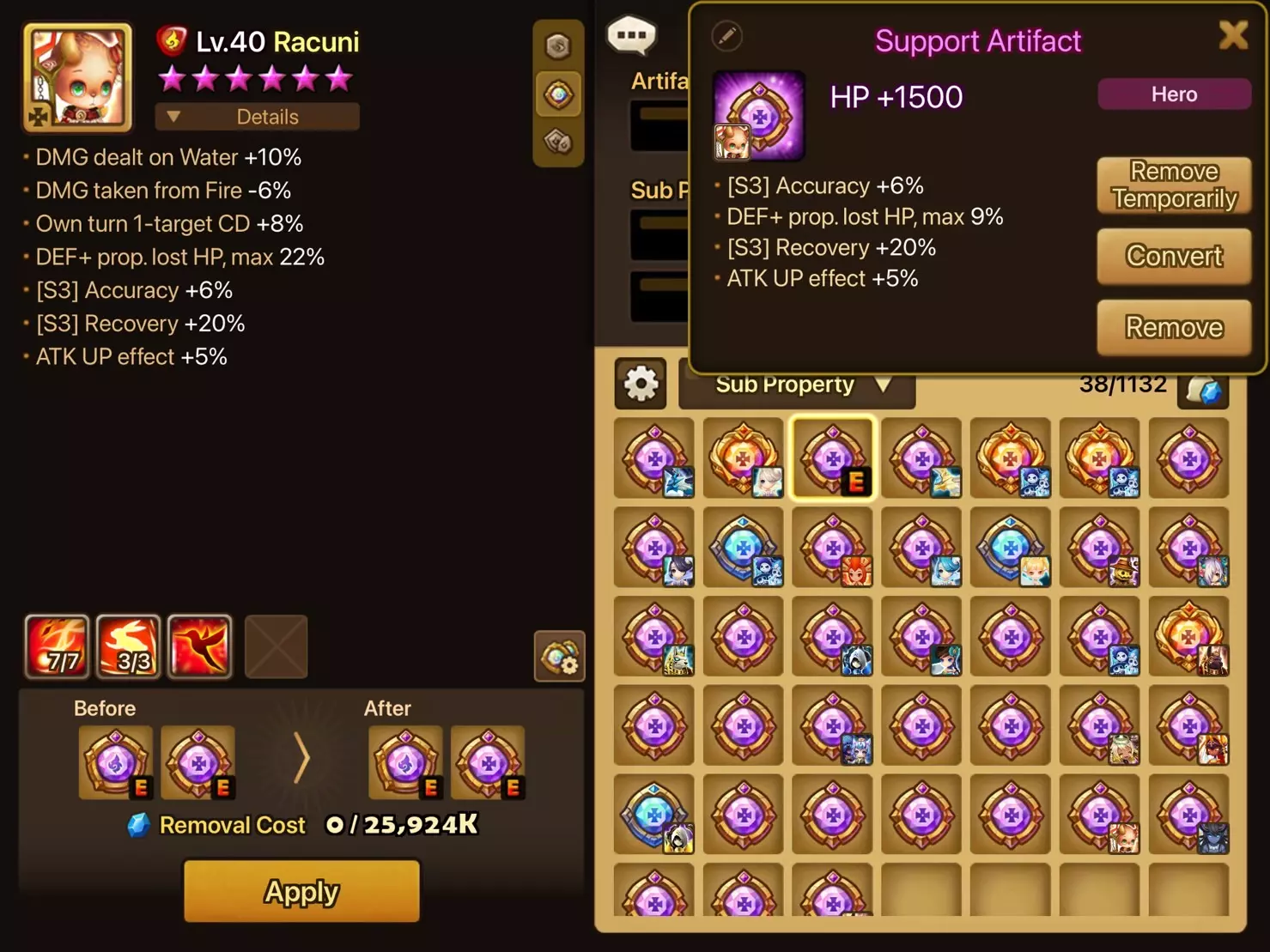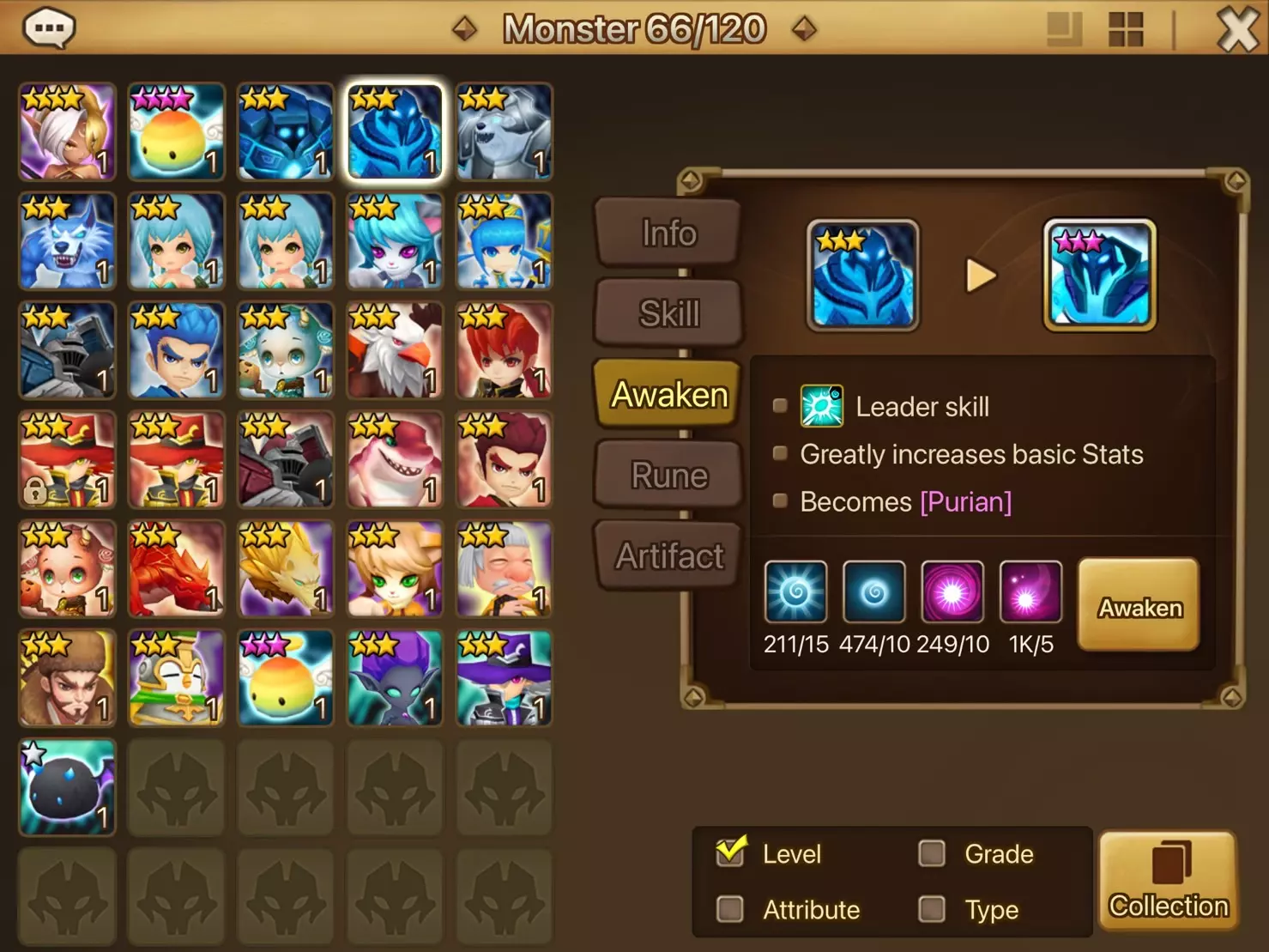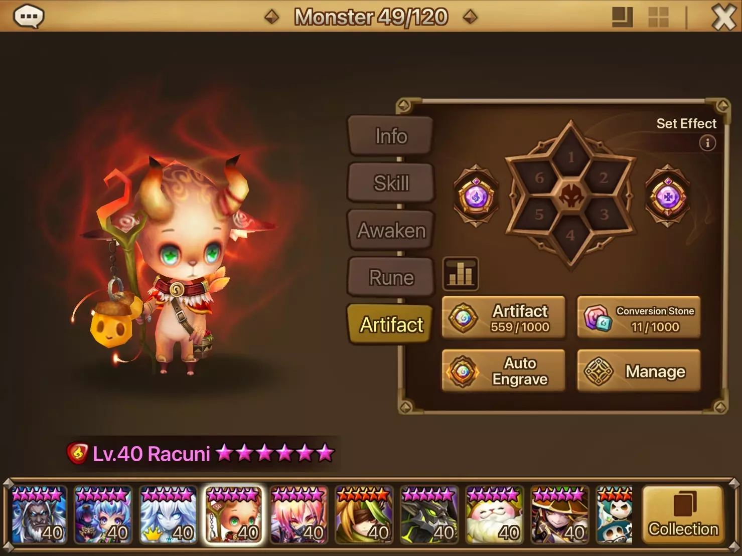 • 只有6★ monsters可装备神器(每个monsters最多装备2个神器)。 • 神器分为两种类型:属性神器和类型神器。每种属性神器和类型神器只能装备给具有相同属性和类型的monsters。