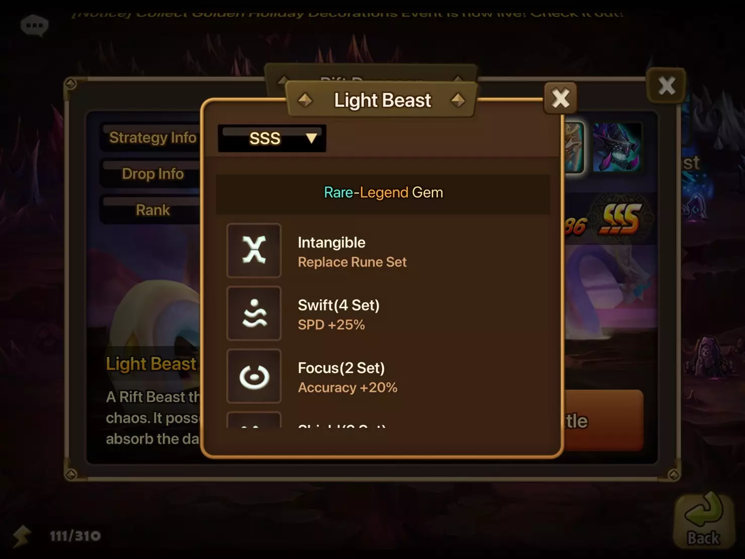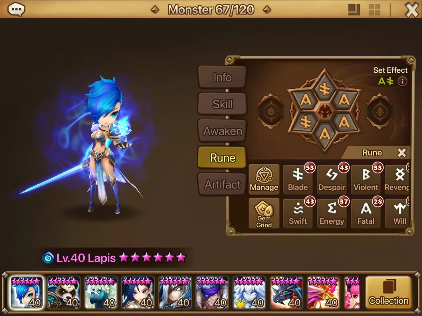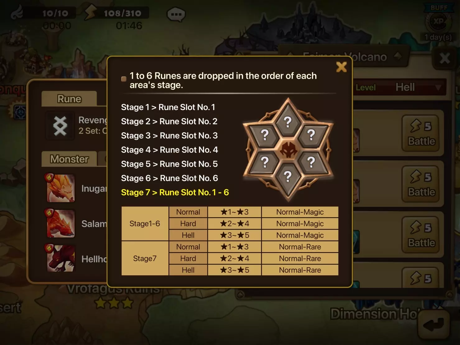 - 符文可增强怪物实力,每只怪物最多可装备6个符文。 - 每个符文都标有1到6的数字,只能镶嵌在对应数字的槽位中。 - 符文等级从1★到6★不等,最高可强化至+15。 - 根据符文类型,将激活并增强独特的套装效果。