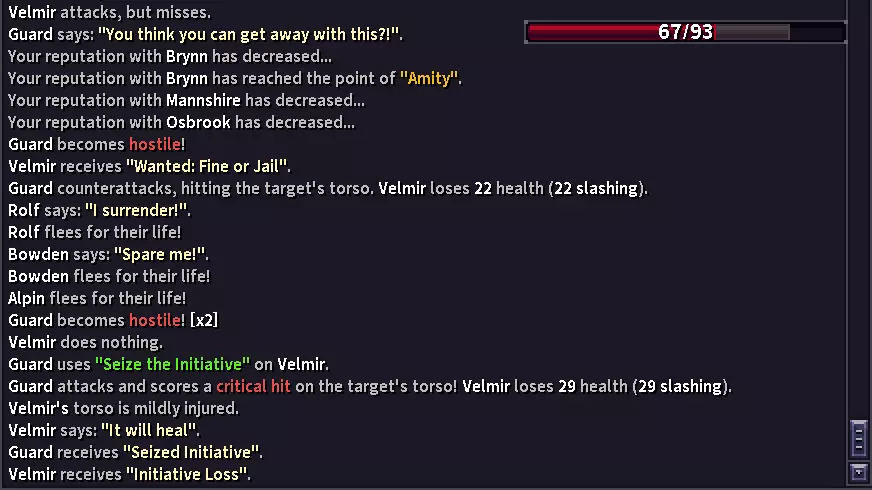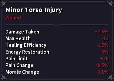 轻微躯干受伤使我的生命值上限减少13,导致实际受到的伤害增加到58。 但为什么生命值上限减少13会变成受到的伤害增加7呢?这是个好问题,我并不完全清楚游戏是如何计算受到的伤害来给出确切答案。从表面分析来看,你“受到”的伤害是生命值上限减少量的50%。 这似乎只适用于由受伤和技能效果导致的生命值上限减少。 因此,你需要注意,如果你受到的伤害可能导致自身受伤,那么你实际受到的伤害可能会比预期的要多。同样的机制也适用于敌人,如果你能对敌人造成受伤效果,他们“受到”的伤害也会比日志显示的要多。补充说明:身体部位健康值与伤势 身体部位健康值是游戏中的隐藏属性,用于衡量身体部位在开始受伤前能承受的伤害量。该属性基于你的总最大生命值(而非阈值)。 关于伤势的详细说明,请查阅相关游戏资料。 因此,提高总最大生命值会相应增强你对受伤的“抵抗力”。 疼痛上限 疼痛上限是一个机制,据我回忆,游戏内并未对其进行任何说明。 简单来说,疼痛上限是某一时刻你所能承受的最大疼痛值。你可能注意到,在某些情况下你的疼痛值会迅速下降,这很可能就是疼痛上限在起作用。