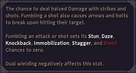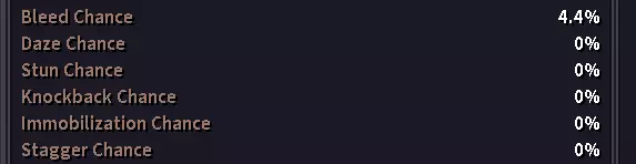 即使你已处于0%失手率,此处的【失手率降低】依然有用。 状态效果: daze、流血及其他 在本节中,我们将状态效果视为daze、眩晕、击退、定身、击退和流血。所有这些效果都可能由武器的固有属性、武器提供的属性或明确提及它们的技能造成。 这些效果的一个特性是它们与闪避和失手的相互作用,如果你留意失手率 tooltip,会发现它提到在失手(或闪避)的攻击中会阻止这些效果的施加。