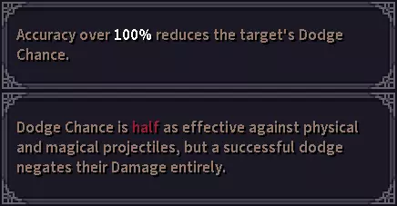 游戏内提示信息 有时你可能会遇到这样的情况:明明凭借装备和技能达到了100%闪避率,但敌人有时仍能对你造成全额伤害,这是为什么呢? 其实,查看精准度和闪避率的提示信息,你就能找到以下解释。