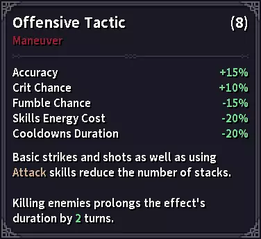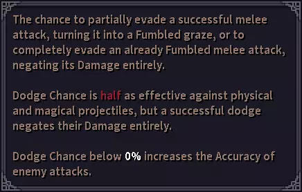 有时候我的图像编辑技能会让我自己都感到惊讶。 你必须注意攻击你的敌人是否拥有高命中率,是否在使用能大幅提升自身命中率的技能,是否在使用降低你闪避率的技能,攻击是否为远程类型(箭矢、弩矢或类似“震颤”的魔法投射物),以及攻击是否被归类为范围伤害(AoE,即区域效果),因为这些攻击会完全无视闪避。所有这些因素都可能导致你的角色受到攻击的全额伤害。 关于命中率降低闪避率的问题,你可能会问:如果我的装备和技能让我获得超过100%的闪避率,这该如何计算呢?在这种情况下,游戏会将100%视为你的闪避率,任何超过100%的数值在战斗中都不会被计入(但会在 buff 和 debuff 计算中被考虑,这部分稍后再详细说明)。 最后,你可能已经注意到这部分内容:闪避率低于0%会增加敌人攻击的命中率。了解这一点非常重要,当你受到降低闪避的技能影响或效果时,以及在使用较重的 armor 时,所有这些情况都会使你更容易被敌人命中。 失手与闪避 正如闪避 tooltip 中所述,闪避会将失手的攻击转化为未命中。了解这一点是构建任何与闪避相关的 build 的重要部分。这类Build不应仅依赖提升闪避率,还应设法降低敌人的命中率和失手率,这样能让你更加安全。 增益与减益 增益和减益是游戏中非常常见的概念,你需要知道它们是对角色属性的任何暂时性(有时甚至是永久性)提升或降低。 增益和减益都会直接作用于角色并立即生效,即使有时不会立即显示在属性面板上(例如不消耗回合的技能这种特殊情况)。